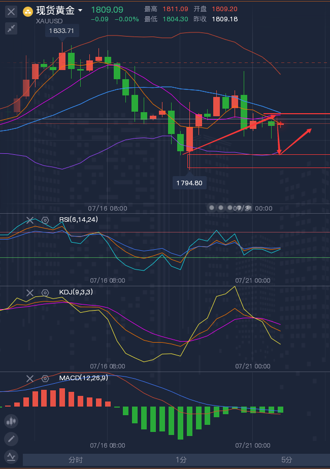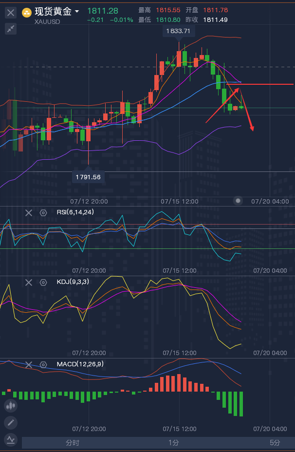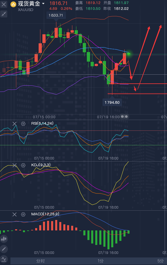 在投资市场上多空快速的转换总是令人措手不及,面对市场剧烈的波动,我们一定要懂得及时的调整策略,兵无常势,水无常形,唯有顺势而为才能游刃有余,立于不败。人生需要一个好的心态,人生的进退,生活的好坏,有时取决于我们的心态,努力是一种结局,放弃也是一种结局。只是不同的心境,有着不同的结果,你笑天是蓝的,你哭天是阴的。学会投资,需要一个好的心态,走好人生,需要一个好的心境,心态决定着你投资的成败。 ——————消息面 7月20日,现货黄金继续反弹,金价周一在震荡交投中持稳,现货黄金尾盘收报1812.64美元/盎司;盘中一度跌超20美元,美元指数触及逾三个月高位,令黄金对其他货
