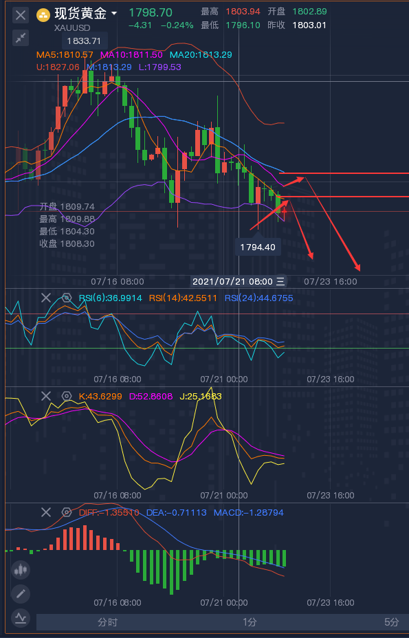 愿你认识我始于文字,合于性格,陷于技术,久于善良,终于人品。 ——————消息面 7月27日,国际金价承压,因为美元走高。但金价徘徊在1800美元下方附近,投资者关注本周的美联储会议,以寻找有关央行何时可能收紧其宽松货币政策的线索。投资者将关注美联储如何应对快速上涨的物价,以及如何看待Delta变种冠状病毒带来的越来越大的威胁。 原油上涨,投资者押注供应紧张和疫苗接种率上升将有助于抵消全球新冠病例激增对需求的影响。但对冲基金和其他基金经理在截至7月20日的一周内卖出了相当于1.72亿桶的六种最重要的石油期货和期权合约,这是自2018年7月以来的最快速度。冠状病