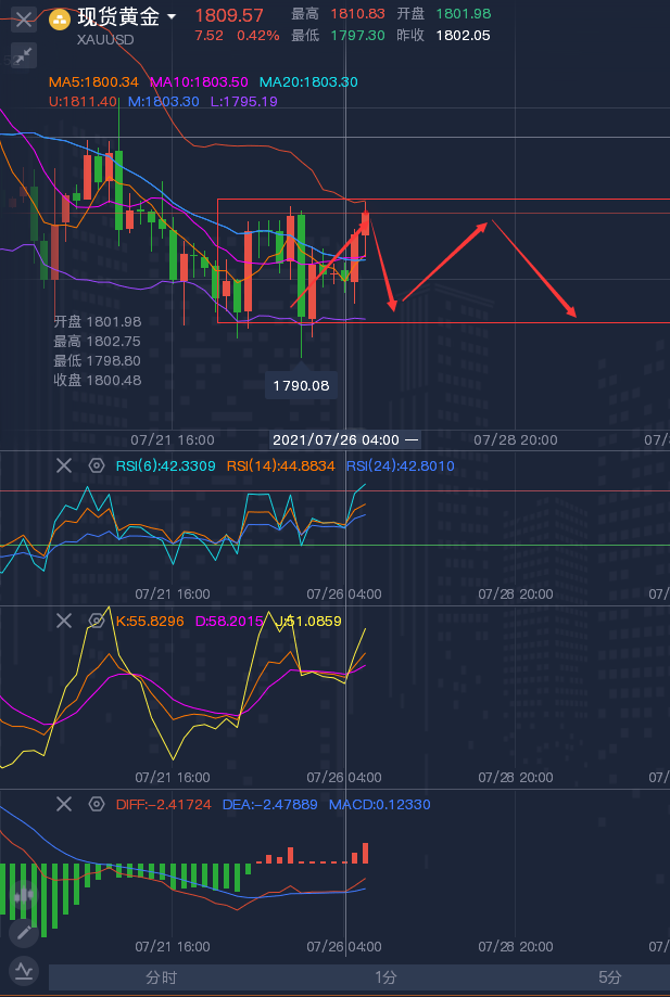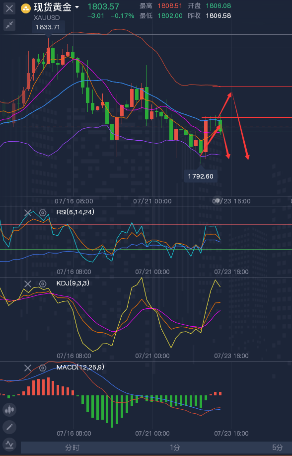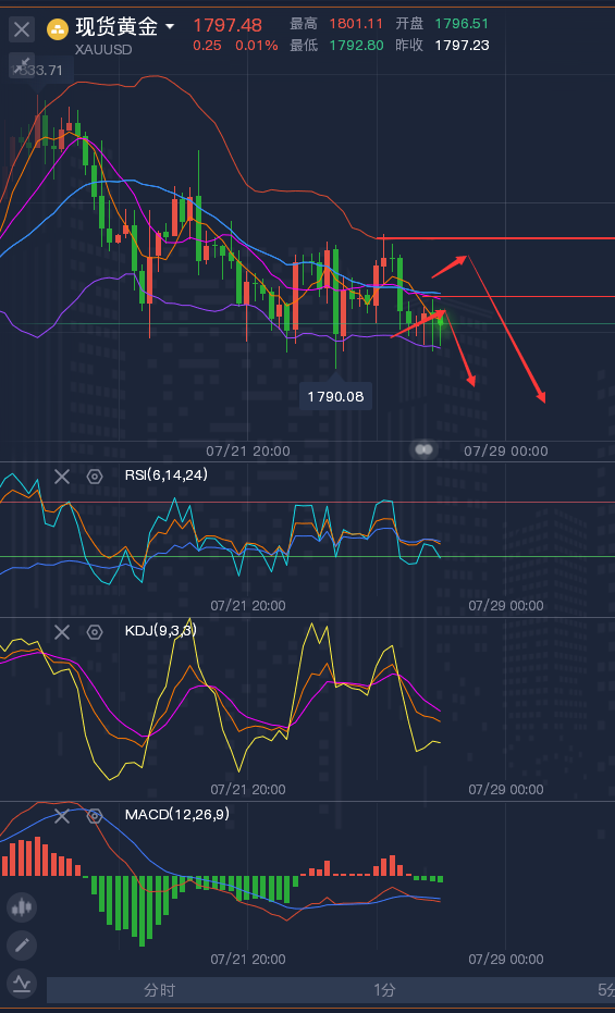 面对投资,信心很重要。创造收益,老师很重要。朋友交往,用心很重要。如果你还在迷茫,如果你还在不知所措,如果你还在亏损,赶紧加入关铭的实盘操作吧!关铭等你! ——————消息面 7月26日,黄金正试图守住每盎司1800美元的关口,但龚关铭认为,鉴于美元走强,可能出现抛售风险。目前投资者需要密切观察,金价能否守住1795美元的支撑成为关键。由于黄金上周未能吸收足够买盘,市场对于金价看法转向偏空。本周市场将重点关注美联储利率决议及美国GDP数据。 原油小幅下跌,油价上周五小幅走高,在从上周一的大幅下滑中强劲反弹后,周线小涨,这得益于对供应将在年底前保持紧张的预期。许