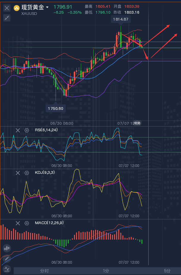 投资路并非坦途,我的文字不华丽,但是却很真诚,你能看到我写的文章,这是一种缘分,我相信缘分,缘分让我们相遇相知,每一份缘分都应该被珍惜,遇到的人不一样,载体不一样,结果就不一样了!选择比努力更重要!选择大于努力,今天的选择或许就是明天的转折!对的时间,跟对的人,做对的事情,这就是投资成功的秘诀,合作只是起点,服务没有终点! ——————消息面 周三(7月7日)亚洲时段,现货黄金小幅上涨,交投于1799附近。周二(7月6日)金价冲高回落,受美国公债收益率回落提振,另外美国服务业PMI的疲软及股市的下滑也给金价提供了支撑,不过,美元触底反弹令多头回吐大部分涨幅。