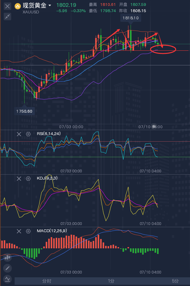 行情不管怎么变,心中没有方向,到哪都是流浪!投资讲究顺势而动,择机而入。做趋势交易,为稳健买单;专业的事情交给专业的人做,为自己的资金负责。如果你想改变现有的投资状况,重新挺直腰杆,那么赶紧找到龚关铭老师,改变命运。在我这里,做单没有任何公式可言,没有死搬硬套的法则,只为你打造适合你自己的操作方案和投资策略! ——————消息面 周一(7月12日)现货黄金小幅下跌,短线金价涨势放缓,金价上周五继续小幅上涨,主要受到疫情蔓延的避险情绪支撑,另外,中国降准的消息以及美元的回落也有利于金价。不过,美股全面大涨限制了金价的上行,市场对美联储马上将宣布缩减政策也相当忌惮。