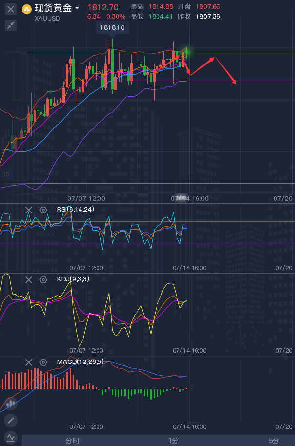 不积跬步,无以至千里;不积小流,无以成江海。骐骥一跃,不能十步;驽马十驾,功在不舍。锲而舍之,朽木不折;锲而不舍,金石可镂。交易就是极少成多,一口想吃个胖子,注定在市场中被淘汰,交易是一场持久战,而不是闪电战! ——————消息面 周三(7月14日)现货黄金小幅上涨,。周二(7月13日)金价几乎持稳,一方面美国6月通胀数据飙升至13年新高,美国股市也纷纷下滑支撑金价,另一方面,美元与美债收益率再度大涨,这提升了黄金持有的机会成本,对金价不利。 原油徘徊于74.98附近,油价油价周二上涨近2%,此前国际能源署(IEA)表示,由于主要产油国在向全球额外供应多少原油
