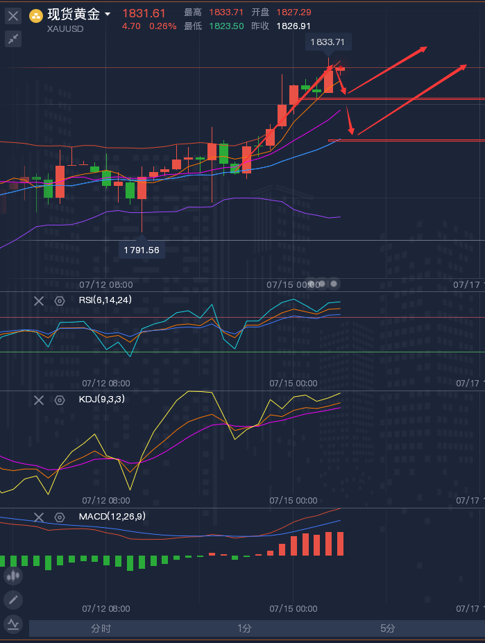 每做一笔交易,有理有据的进场,且严格遵守这个市场的规则,在一个正确的引导之下,实现长期稳健获利的目标是很容易实现的。精准的走势分析,专业的团队技术分析,负责的指导老师,全程行情实时追踪,盈利离你还会远吗!机会总是留给有准备的人,但同样也留给会选择的人真实的实力给你展示,切实的利润让你开心!如果你在投资路上遇到了困扰,找不到方向长期处在亏损中,不妨可以和龚老师聊聊,成功不是靠运气,选择大于努力!愿你认识我始于文字,合于性格,陷于技术,久于善良,终于人品。 ——————消息面 周四(7月15日),国际金价基本持平,徘徊在前一交易日触及的6月16日以来高点1829.85美元