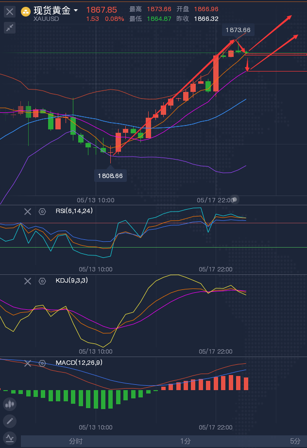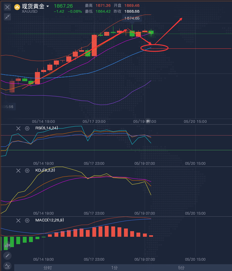 永远不要和行情背道而驰,与行情反着来是禁忌,你一个人对抗不了整个市场,顺势操作即可,行情千变万化,即使是老师也不可能完美把握每一次行情,龚关铭个人看来说的话,如果我对行情把握不准时,我就不会给单,宁愿现在不做,也不会让信任我的投资朋友们轻易进场,因为与我合作的投资朋友是建立在信任的基础上,不可能因为把握不准的行情而去拿他们的资金开玩笑,那是对相信我的投资朋友的不负责任,行情天天有,不急不躁,一步一个脚印向更美好的生活出发。 ——————消息面 5月24日讯—— 上周,加密货币、股票甚至大宗商品都出现了大规模抛售。但有一个板块表现突出,那就是黄金接近每盎司1900美元的水平。比特币的大量流出也