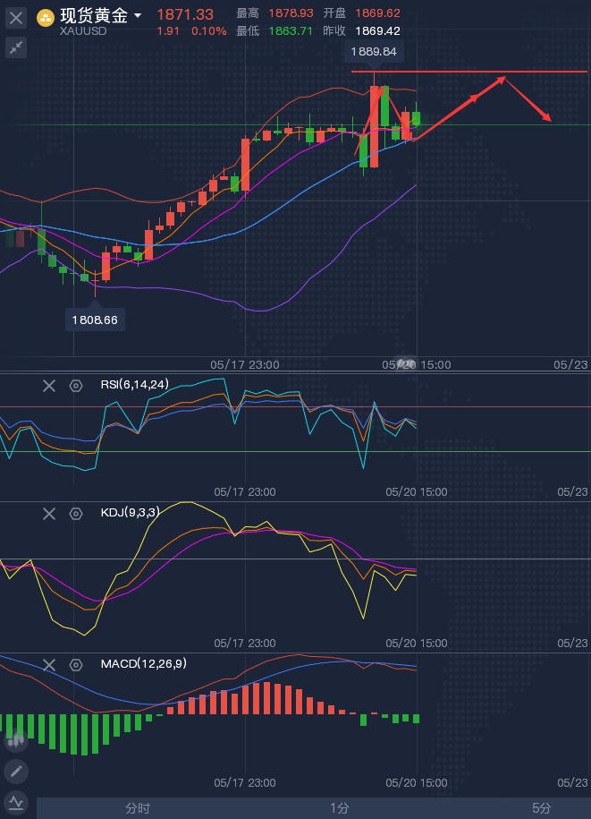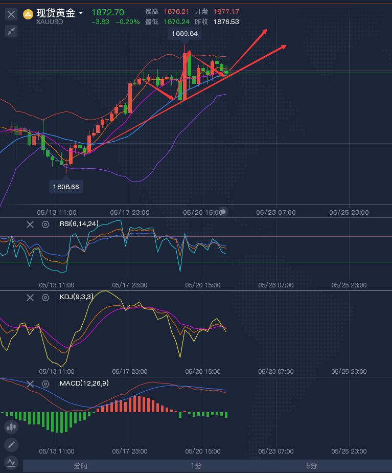 投资是长久的事情,以饱含学习的思维去看待投资,你的投资路才能够越走越远。如果你是散户不妨与波师胜筹交流沟通,一个优秀的分析师只会让你进步。如果你认为自己的老师很专业,不要盲目的去追求做单,你不妨多向他多请教技术和操盘技巧,行情判断,我相信你的老师一定很乐于教导你,再者与我沟通,我也会很乐意帮助你。如果是在做投资的路上亏损,或者近期存在套但情况的朋友,在我力所能及的情况下,我将为你免-费解,和制定适合你的盈利计划。 ——————消息面 (5月25日)亚洲时段,现货黄金小幅下跌,交投于1877附近。周一(5月24日)金价持稳,一方面美元下滑及美联储官员一如既往地鸽派表态支撑了金价,另一方面股市上