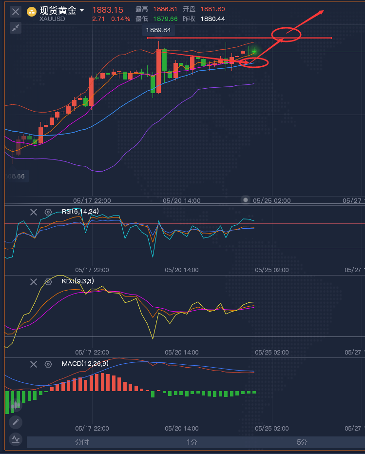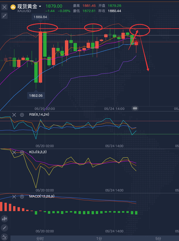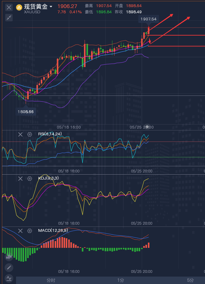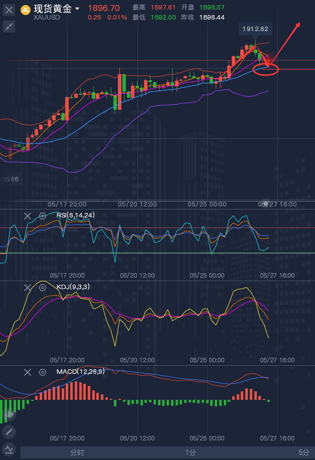永远不要和行情背道而驰,与行情反着来是禁忌,你一个人对抗不了整个市场,顺势操作即可,行情千变万化,即使是老师也不可能完美把握每一次行情,关铭个人来说的话,如果我把握不准,我就不会给单,更不会让我的投资朋友轻易进场,因为与我合作的朋友是建立在信任的基础上,不可能因为把握不准的行情而去拿他们的资金开玩笑,那是对投资朋友的不负责任,更是对自己的看轻。 ——————消息面 (5月27日)亚洲时段,现货黄金小幅下挫,交投于1894附近。周三(5月26日)金价冲高回落,收跌0.14%,主要因为美元及美债收益率录得上涨,另外,逆回购规模不断攀升,美联储官员夸尔斯对讨论缩减购债也持开放态度,这些因素共同拖累