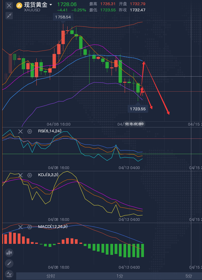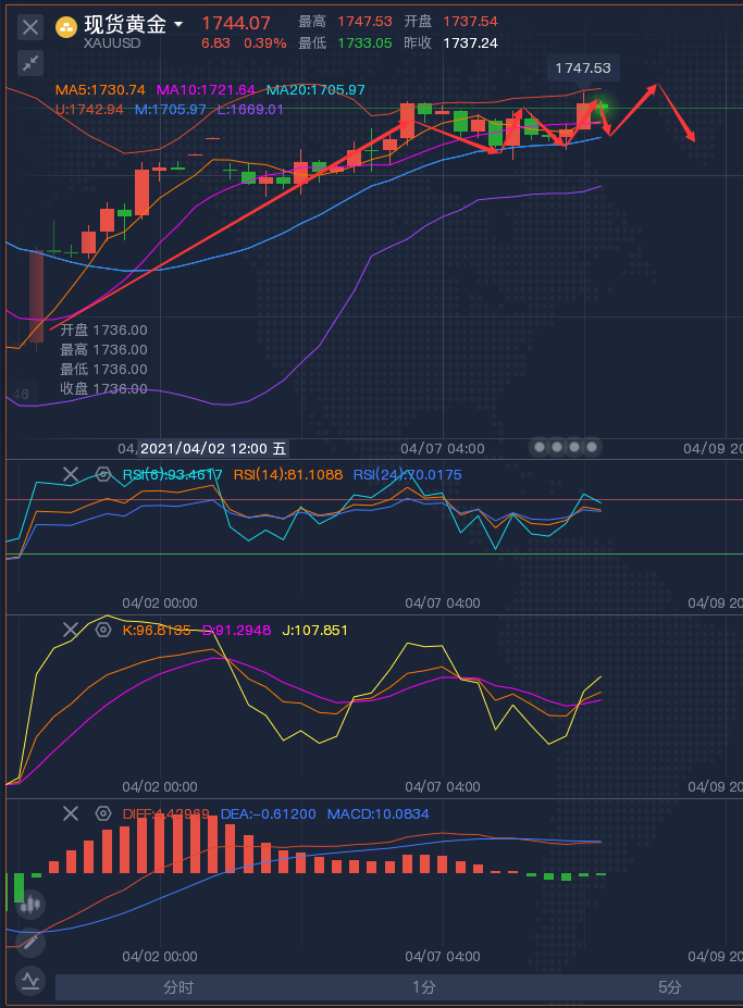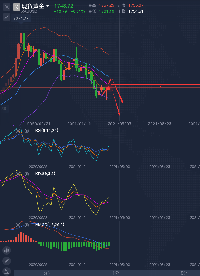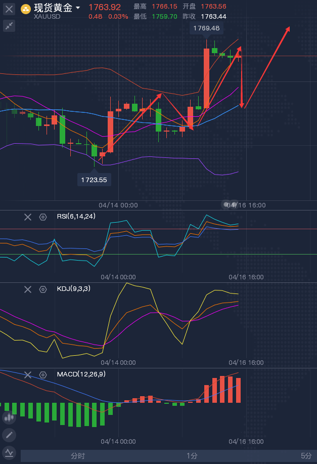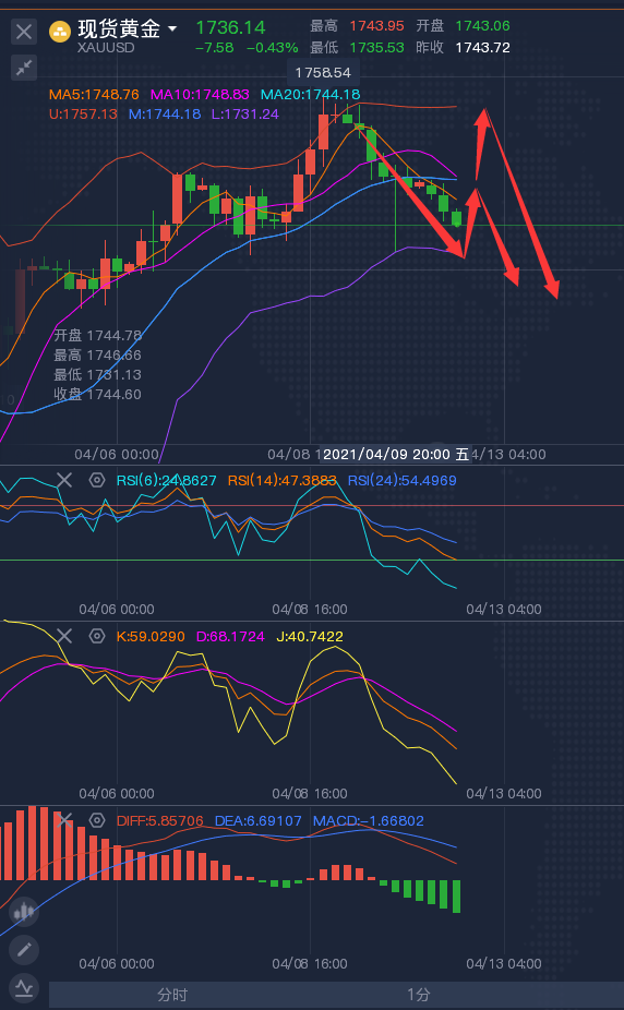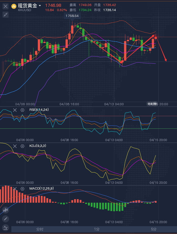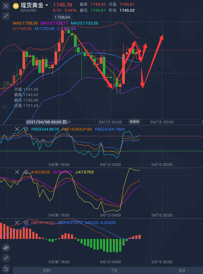 选择和什么样的人在一起,久而久之你就会变成什么样!投资的路上,你的选择,也决定了你的口袋和思维。这就是为什么有人三五年还是在找老师。有人三月五月,却很坚持的做技术分析。时间并不是障碍,失败不在外在,重点还是自己! ——————消息面 4月15日,国际金价重新走强,受美元疲软提振,美债收益率走低,也利好金价。但金价仍维持区间震荡。投资人等待稍晚美国的初请失业金数据和3月零售销售数据,以获得美国经济复苏状况的更多线索。美联储或会尝试抑制长期收益率上升,这类政策将削弱美国资产的收益率优势及其对美元的支持。 原油价格续创一个月高位,因国际能源署(IEA)和石油输出国组