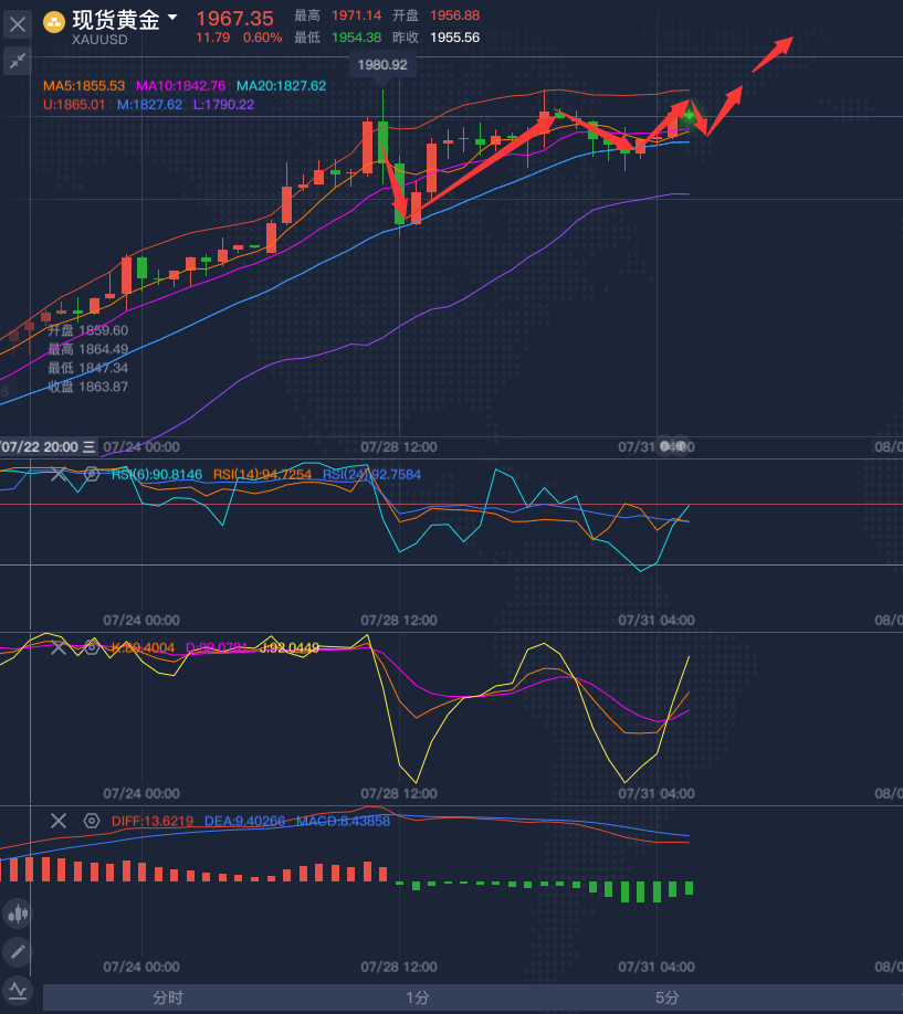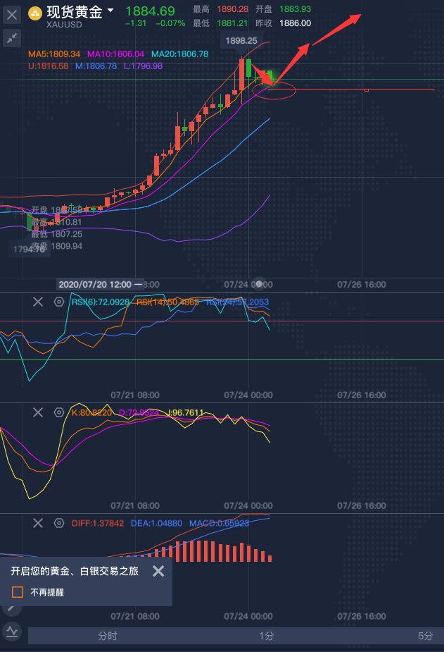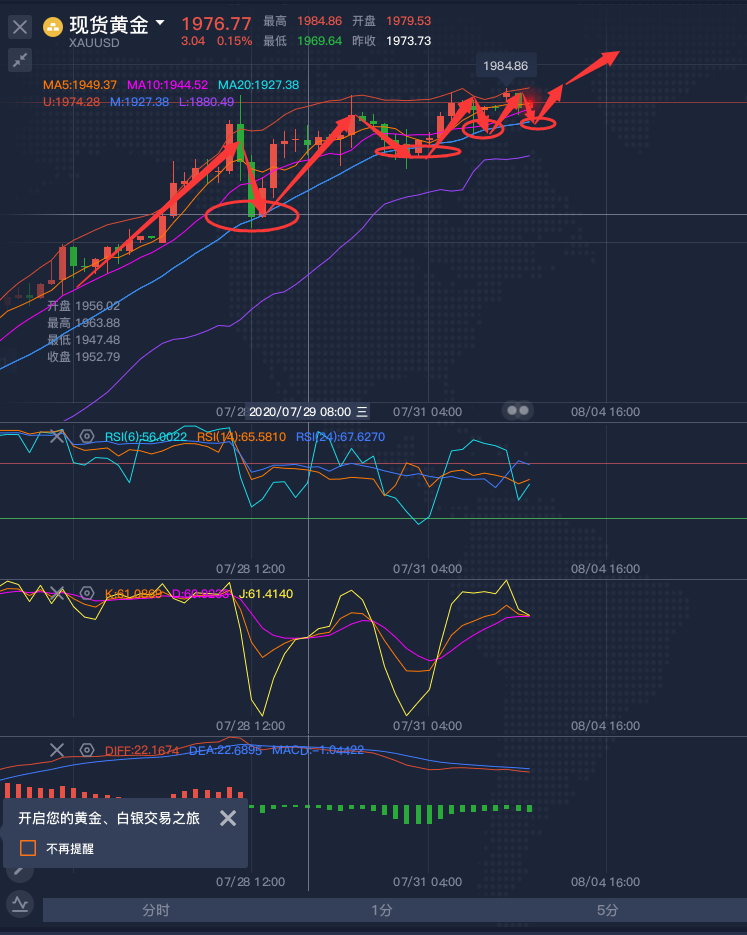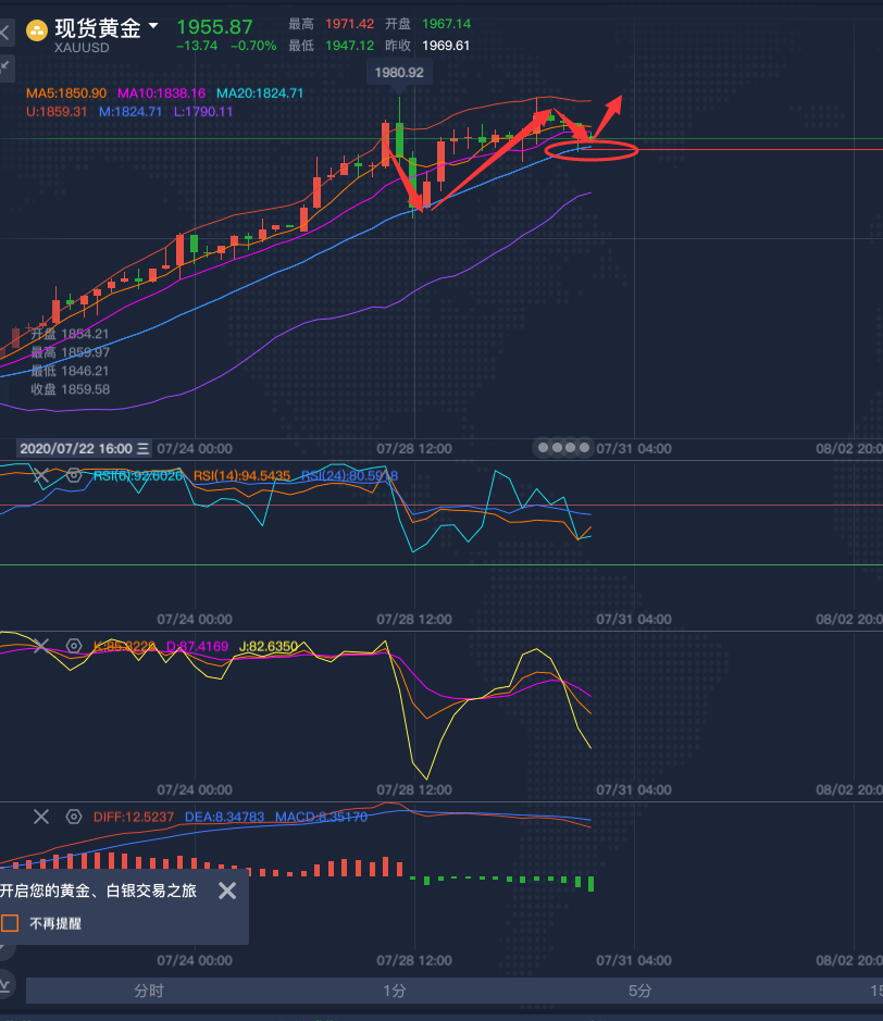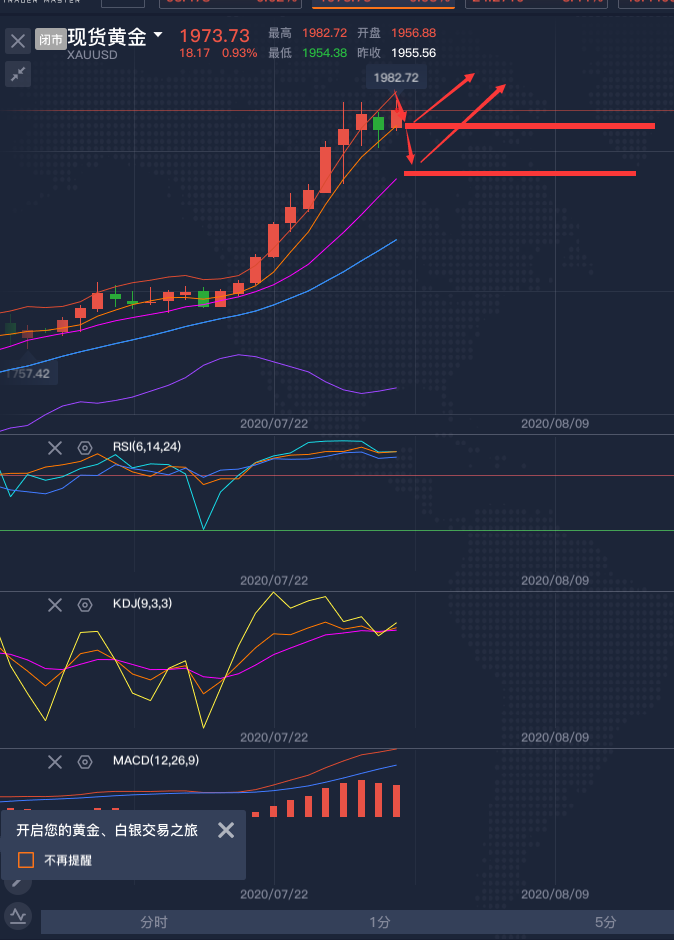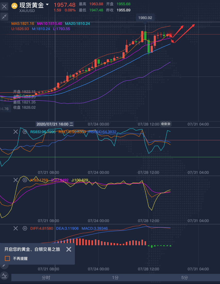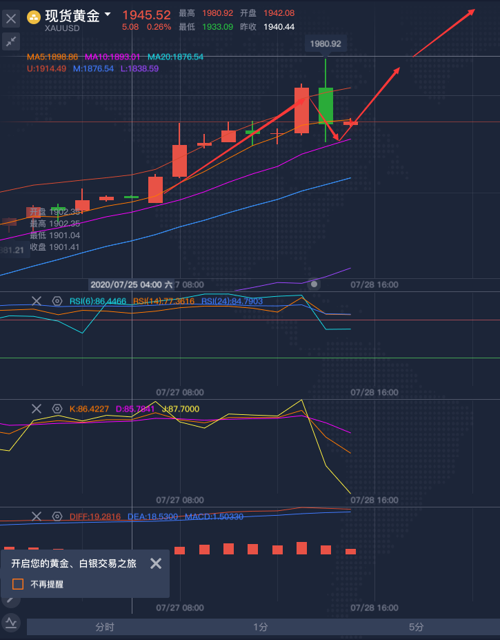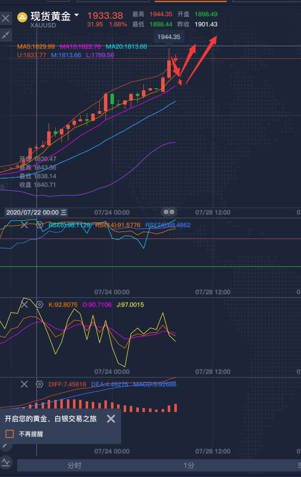 不是市场不适合,不是行情不给力,是站错了位置,走错了方向。换个思路,或许你会发现处处都布满金条。泥泞路上的奔驰,永远跑不过高速路上的夏利!投资切忌有一夜暴富的想法,我们要做的是在市场中长久生存。不奢求次次买底出顶、卖顶平底,戒贪戒慌,获取能够到手的利润;以平常心看待市场每一次波动,戒贪戒慌,不求成为卖顶买底的高手,只求顺势而为,稳健获利,落袋为安! ——————国际消息面 7月27日,现货黄金创纪录新高,现货黄金现报1931.74美元/盎司,涨幅1.56%,现货黄金最高至1944.68美元/盎司,新冠病毒疫情爆发对全球经济的破坏巩固了黄金作为避风港的地位,投资者纷纷涌