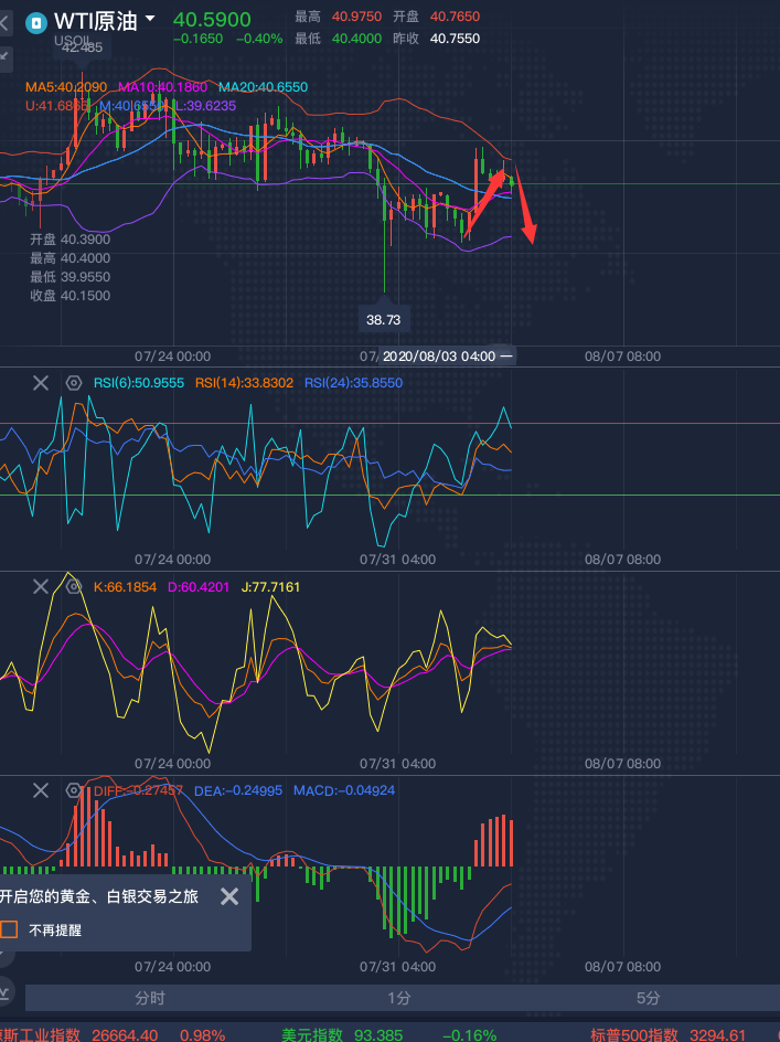 喜欢就关注,认同就点赞,受用就收藏。有疑问可咨询,留言,欢迎交流技术、方法、心得;稳健在于积累,交易中短线结合!致力于给出最准确的交易策略! ——————国际消息面 8月4日,现货黄金震荡,现货黄金现报1973.98美元/盎司,跌幅0.15%;全球股票市场依旧表现强劲,这对黄金有所不利,随着赚钱效应强化,黄金可能需要平静一段时间,但多头趋势并未改变。笔者龚关铭认为,美元的反弹无疑已经使黄金失去了一些上涨动力;美元升值会使以该货币计价的资产变得更加昂贵;在上周创下历史新高后,黄金出现获利回吐似乎是理所当然的事,但没有任何迹象表明现阶段金价会出现更大的回调。 原油