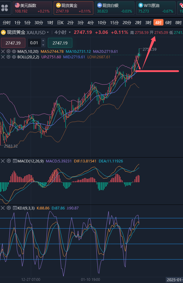 交易就是一场修行,修行的目标是为了明心见性;明心见性后,并不意味着我们获得了某种超能力,而是更加的了解了自己、了解了交易的真谛,找到合适自己的方法,坦然接受交易中的不完美,不与市场对抗,将交易中的大亏避免掉,自然就能稳定盈利了。 ————————消息面 周三(1月23日)现货黄金窄幅震荡,目前交投于2753美元/盎司附近。金价周三飙升至近三个月高点2763.27美元/盎司,在略低于历史最高水平下方交投,受美元走软以及美国总统特朗普的政策计划不明确推动。投资者担心特朗普的政策可能引发贸易战并加剧市场波动。 原油延续下跌,目前交投于74.8美元/桶附近。特朗普新****可能采取的制裁措施仍不明确