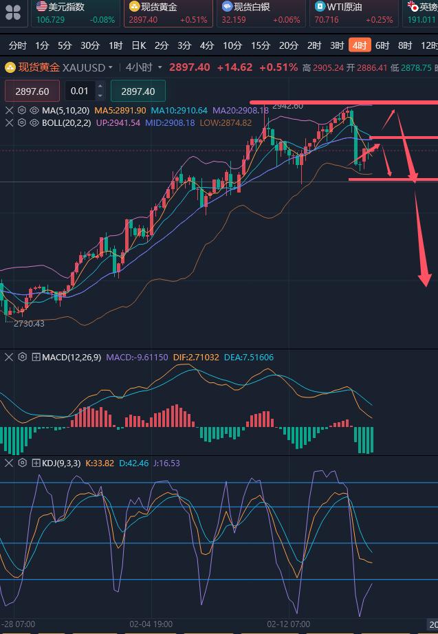 新的一年,是机遇的起点,是财富的转折,蛇年已至,万象更新,市场风云变幻中,蕴藏着无限可能,今年让我们一起用智慧和勇气,开启财富新篇章! ————————消息面 周一(2月17日)亚市早盘,现货黄金价格企稳,目前交投于2895美元/盎司附近,继续受多头获利了结拖累,另外,特朗普称很快与普京会面,也令避险情绪有所减弱,不过由于美国总统日,美股休市一日,贵金属及原油市场提前休市,故此,空头力量或有限,日内关注美联储理事鲍曼发表讲话! 原油价格目前交投于70.8美元/桶附近。俄乌冲突传出停火谈判消息,市场普遍认为若此次谈判取得实质性进展,俄罗斯原油供应可能回归市场的预期下,国际原油价格延续回调。接下