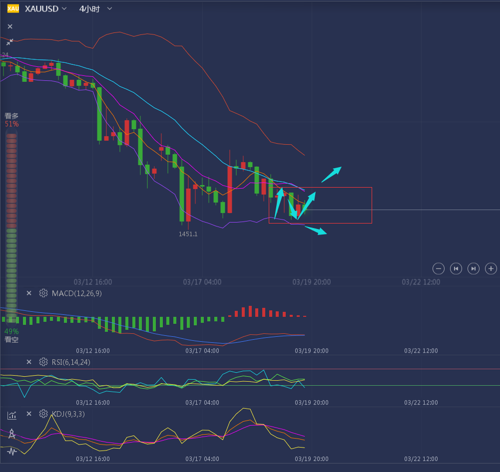 交易核心思路方案必须是经过了长期大量的实战成败之后,并在反复的总结、学习与深思中形成的对市场高度的认知,并将自己不断总结提高的认知反复地指导实战并在实战中不断加以充实完善,在长期反复不断轮回的之后形成的相对固化的能够指导交易生存并发展的核心交易准则的概括和总结。不要拘泥于和过于相信书本上的一些东西,一定是需要结合自己的交易路程进化而来的方案,因为每个人都是一个不同的个体。 ——————消息面 3月23日,美元指数冲高回落,避险买盘一度短线继续给美元提供上涨动能,但获利了结盘和投机空单的增加令汇价面临短线回调风险;现货黄金在1490附近徘徊,逢低买盘和贵金属的抛售来回拉锯,短线存在震荡反弹的机