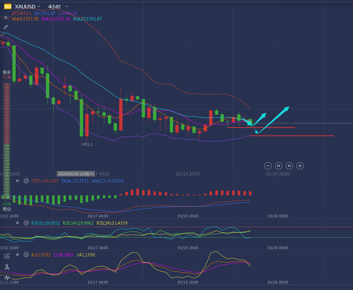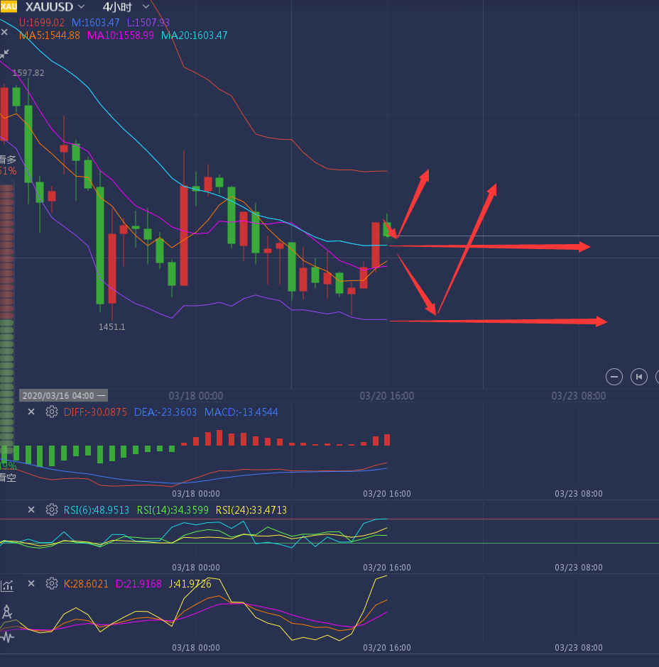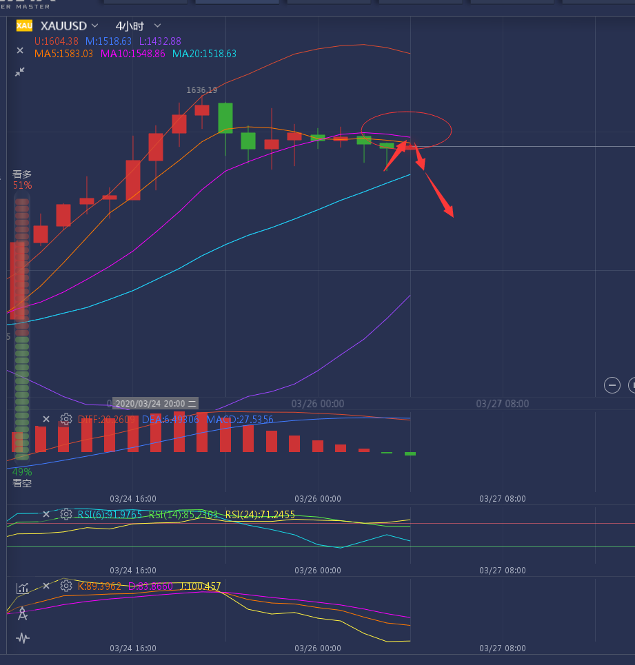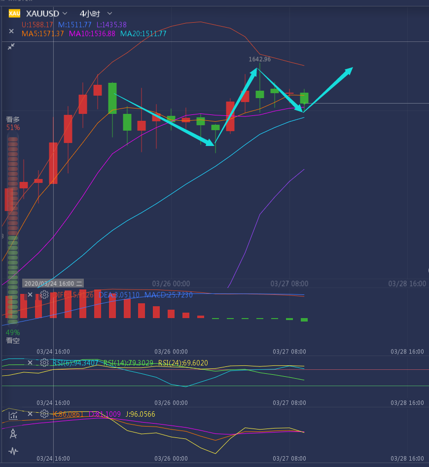 市场上常常听到这样懊悔的话语,“如果我早这样就会少亏点钱”。“如果我不犹豫,我将狠赚一把。”然而接下来的市场便淹没了说这些话的人,却又回响起另一些人的感叹。的确,我们的犹柔寡断和贪心耽误了数不清的机会和好局。不能自控的结果,就要付出惨重的代价。可能煮熟的鸭子飞走了,可能一次失误断送几年或几十年来的辛苦。 ——————消息面 3月25日,现货黄金冲高回落40美元,金价现报1605.64美元/盎司,跌幅1.63%;金价高处不胜寒,美联储的无限宽松令金融市场一片欢腾,黄金反弹逾百美元,但贵金属高处不胜寒,进一步上升面临较大阻力,因为疫情仍在扩散中,且对全球经济造成重创,避险无法支撑黄金创出新高,需