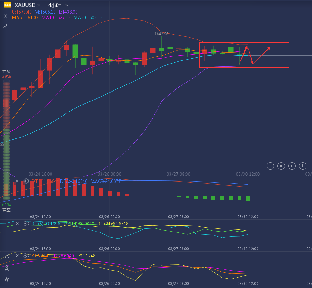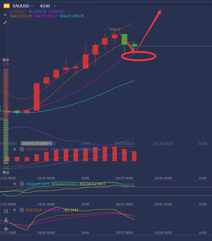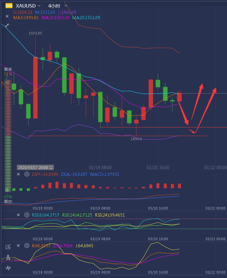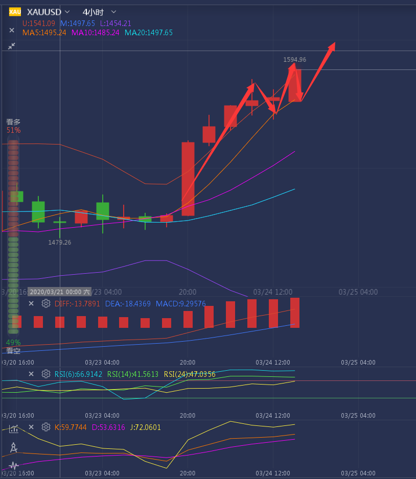 市场上常常听到这样懊悔的话语,“如果我早这样就会少亏点钱”。“如果我不犹豫,我将狠赚一把。”然而接下来的市场便淹没了说这些话的人,却又回响起另一些人的感叹。的确,我们的犹柔寡断和贪心耽误了数不清的机会和好局。不能自控的结果,就要付出惨重的代价。可能煮熟的鸭子飞走了,可能一次失误断送几年或几十年来的辛苦。 ——————消息面 3月25日,现货黄金冲高回落40美元,金价现报1605.64美元/盎司,跌幅1.63%;金价高处不胜寒,美联储的无限宽松令金融市场一片欢腾,黄金反弹逾百美元,但贵金属高处不胜寒,进一步上升面临较大阻力,因为疫情仍在扩散中,且对全球经济造成重创,避险无法支撑黄金创出新高,需