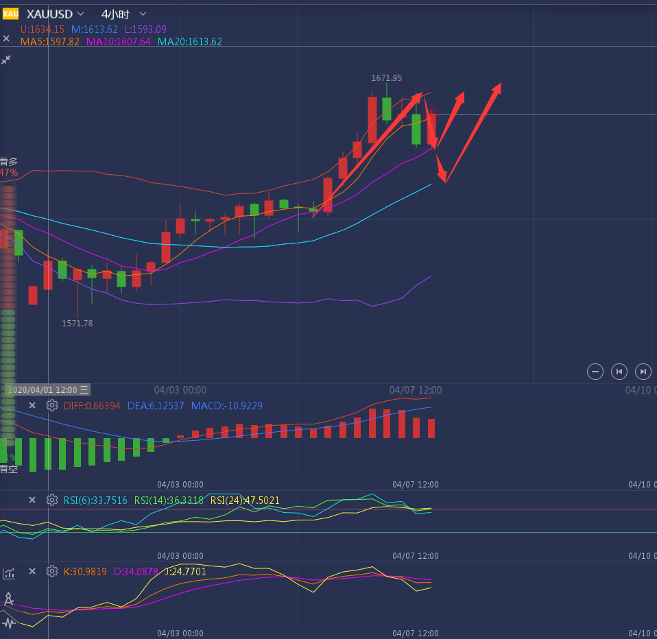 耐心、勇气、信心对做交易来说非常重要。要有耐心等待符合入场规则的投资机会;当机会出来后,要有勇气杀进去;进场后,要有信心坚定持仓。关于信心,是一种反映自己对是否有能力成功地完成某项活动的信任程度的心理特性,属于心理层面,贯穿交易活动的始末,是重中之重。所以,在做投资中,失去信心是最终失败的根源,也是最可怕的。 ——————消息面 4月7日,现货黄金窄幅震荡,黄金多头开始指向前期高位1700上方,周二日内逼近1680大关,英国首相约翰逊病情恶化已被转移到重症监护病房,而美元指数也有所回落,但全球进一步的宽松行动支撑着黄金市场,美国日本都有可能采取进一步的刺激行动。龚关铭