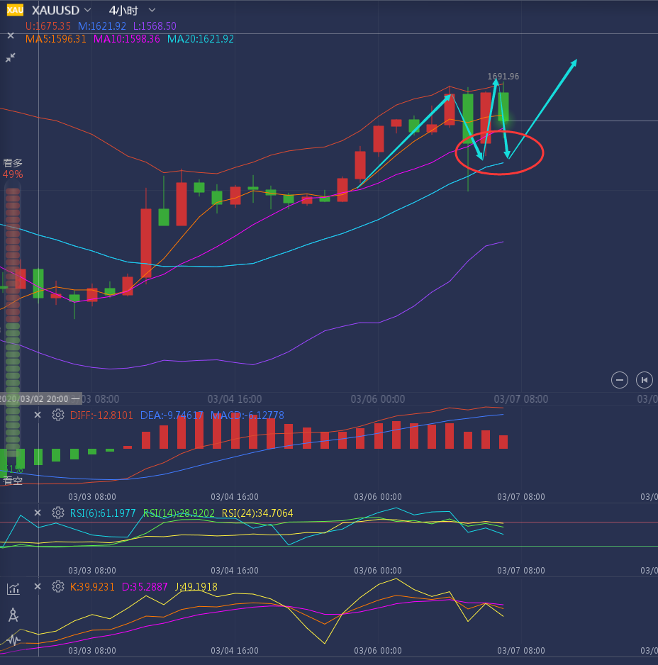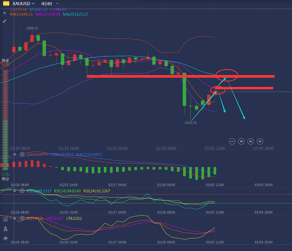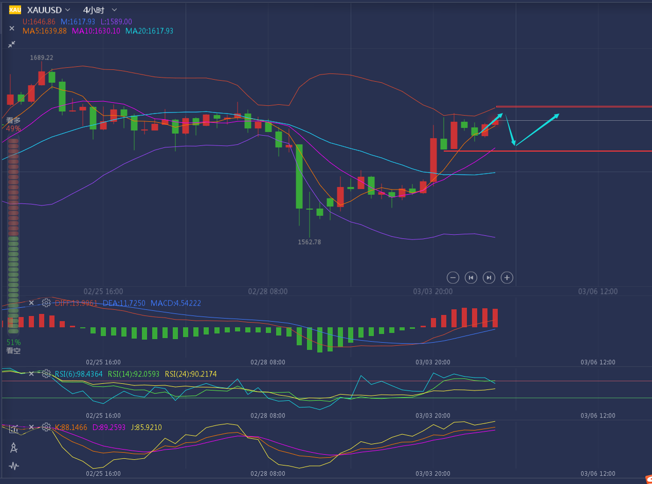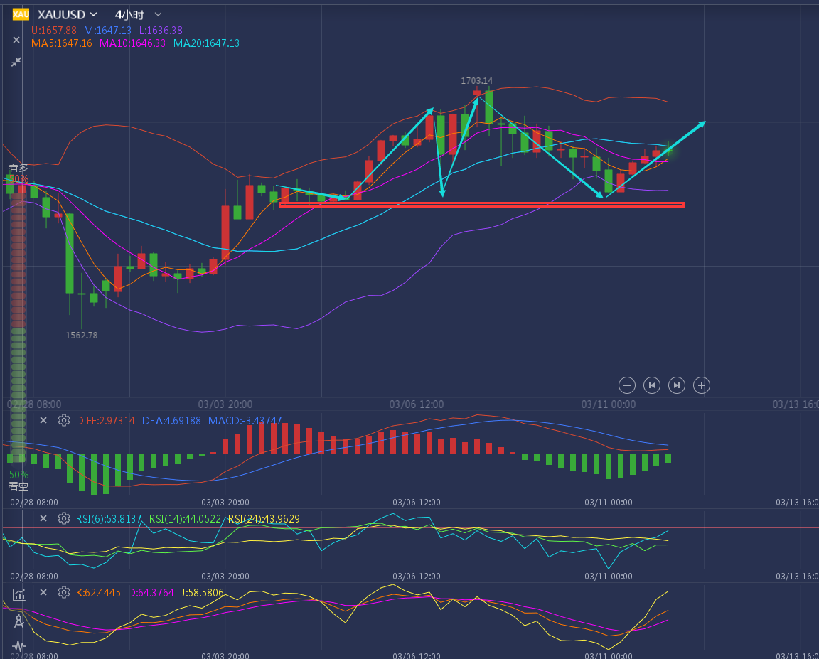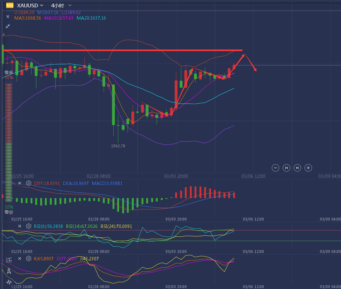稳定盈利其实很难,但不代表做不到!跟对人做对事!让你见证什么是真正的交易!这,或许是很多人做交易这么久都从未感受到的感觉而已!这不怪你,要怪只能怪你没有在对的时间里选择对的人! ——————消息面 3月3日,投资者对美联储的降息预期进一步升温,日内美元指数四连跌,交投于一个月低位,同时美债收益率也有所下跌,这提振了黄金的吸引力,但同时贵金属也受到强劲的风险资产的压制,预计短期黄金很难再获的持续的升势。基金结清美元兑日元多头头寸,同时预期中的G7声明不会要求增加新的财政支出或央行协同降息。这令投资者依旧担忧疫情对经济的冲击,避险需求支撑日元。随着风险资产普遍上扬,原油市场情绪好转,而OPEC+