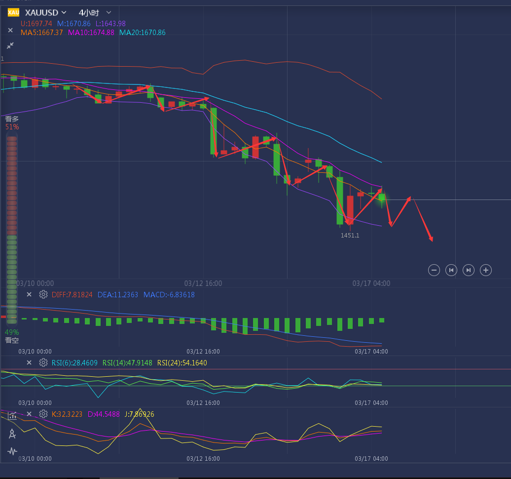 这个市场就像电影放映室,每天数不清的人一批批的来,一批批的走,有些人交学费得到了经验和心得,后面东山再起的可能性较大,可有些人却如同丢盔弃甲般心神俱伤,如果心态都已经崩溃了,那么我劝你先停下脚步,好好反省和平静自己的心态,不然将连番受挫,到时候不仅资金出现危机,人也会一步步是去意志,如果我们是相信自己能做好的,胜不骄败不馁,那么美好的生活就是来日可期的! ——————消息面 黄金方面,周一现货黄金一度跌逾5%,刷新去年11月26日以来新低至1451.55美元/盎司,因全球股市大跌,流动性需求继续驱动投资者抛售黄金。由于黄金近期因流动性需求跟随股市下跌,随着股市波动性创历史新高,预计黄金波动也