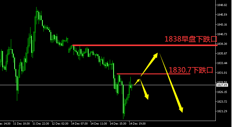 今日美盘行情分析: 黄金在欧盘震荡下行,直接跌破了1824前期低点位置,目前最低触及1819附近,我们在底部1827附近的多单小损离场,耐心等待反抽之后参与空单,行情既然已经下破,那么美盘就反抽做空为主。 现在的行情已经下破了,破了宽幅区间的底部,也就表明震荡行情结束,会开启新一轮的跌势,所以今晚美盘操作上高空为主即可!二次下跌破底的下跌口压制在1830.7位置,强压在1835以及1837早盘高低点位置,所以今日美盘大概思路就出来了,反抽不破二次下跌口做空,破位则等早盘高低点位置做空!下方短线支撑在1815位置,强支撑在1807附近。 简单理解,今日美盘反抽不破1830.7做空,