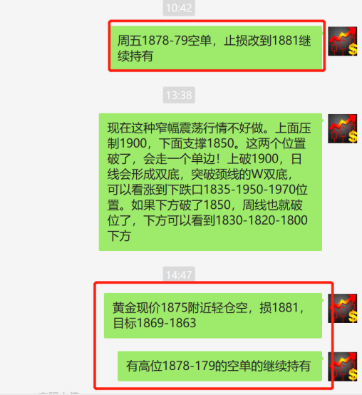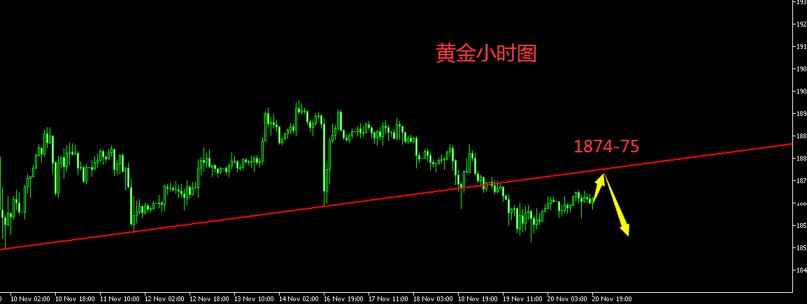 美盘行情分析: 黄金亚盘横盘,欧盘开始震荡回落,目前最低触及1864附近。上周五我们就看反弹趋势线做空的,周五给出及1878-79的空,今日欧盘给出了1875附近的空,两张空单都成功拿下,继续等美盘! 现在这种宽幅震荡行情不是特别好做,顺势卡点操作最好。日线来看,上面压制1900,下面支撑1850。这两个位置破了,会走一个单边!上破1900,日线会形成双底,突破颈线的W双底,可以看涨到下跌口1935-1950-1970位置。如果下方破了1850,周线也就破位了,下方可以看到1830-1820-1800下方,所以没破区间之前,谨慎放低仓位操作! 如图所示,这是小时线下行通道,周五尾