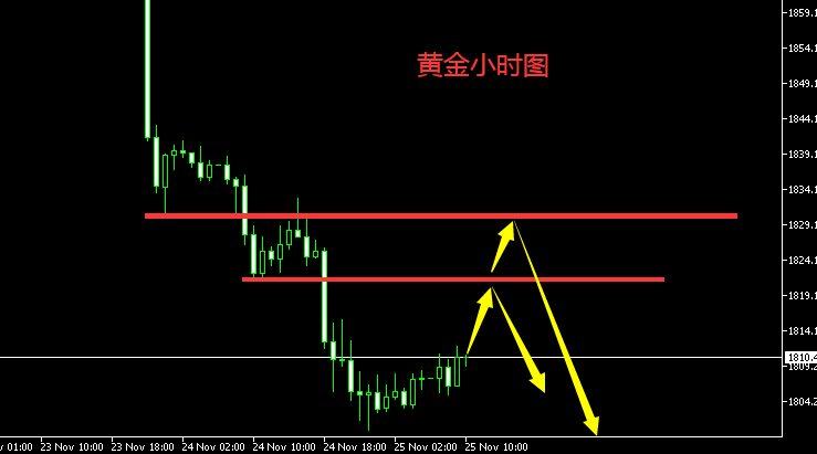 今日行情分析: 黄金昨日窄幅震荡,尾盘下探最低 1804附近,美盘最高上行到1817位置,整体低位盘整修正。今日由于感恩节,美盘休市,预计主要波动在白天,当然也不会太大,所以注意持仓风险! 黄金现在四小时 MACD已经背离,在0轴上方翻红,快慢线也金叉,而且四小时5日和10日均线交叉拐头向上,所以今日整体是看震荡反弹的。下方短线支撑在1808附近,强支撑在昨日1804低点,分水岭依旧在1801位置。上方短线压制在1817昨日高点附近,强压在1827-1830二次下跌口附近。 简单理解,今日行情先看震荡反弹,下方回落给到 1808附近做多,破1801离场,目标看1817-1827位