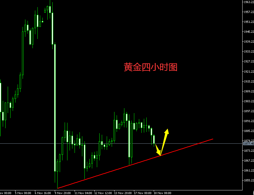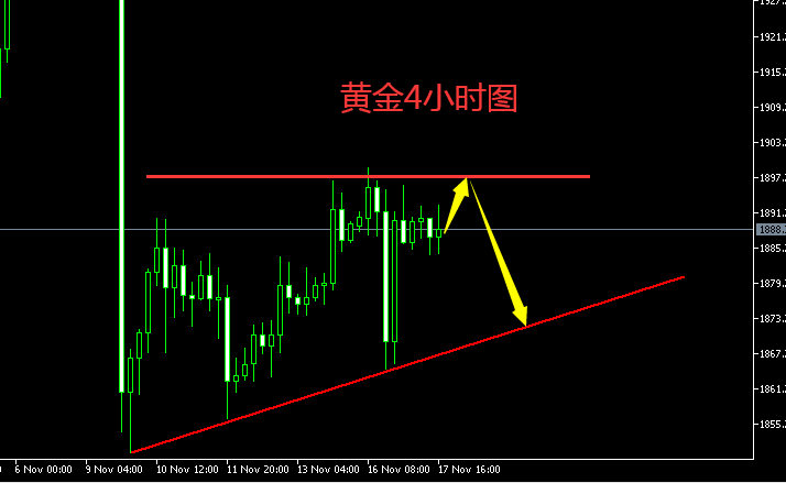 今日行情分析: 黄金昨日借助消息面影响短线下挫30个点,但是尾盘直接V反转拉升,最高触及1896附近后开始高位横盘,整体依旧没有摆脱震荡,所以还是切勿追涨杀跌,卡高低点操作即可! 如图所示,这是黄金四小时图,是四小时震荡上行通道,通道上沿强压位在1901附近,昨日美盘以及昨日早盘高点短线压制在1896-1898位置,同时日线的10日和20日均线交叉压制在1896附近,所以今日上方压制在1896以及1901位置。 下方短线支撑在1880附近,这里是昨日大跌后首次反抽的高点位置,突破后形成短线的顶底转换支撑,同时这里也是日线的5日均线支撑位。强支撑在昨日二次起涨点1871附近。