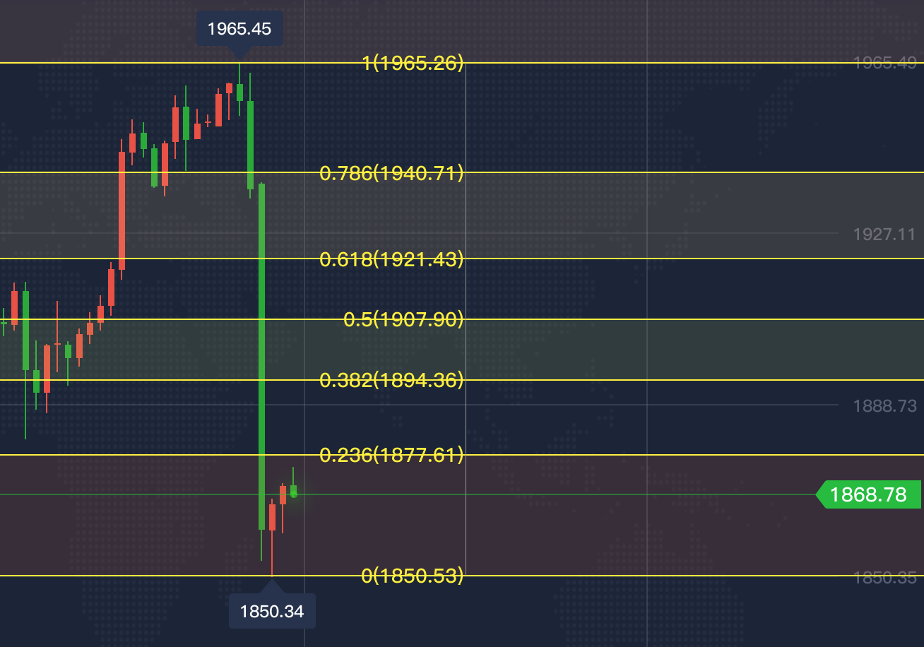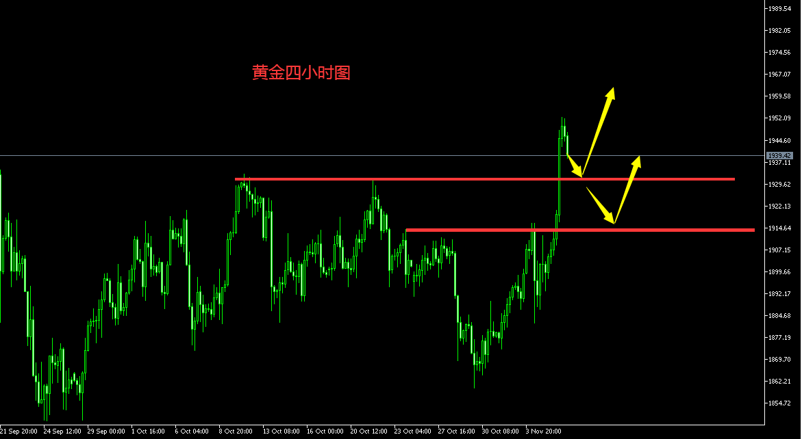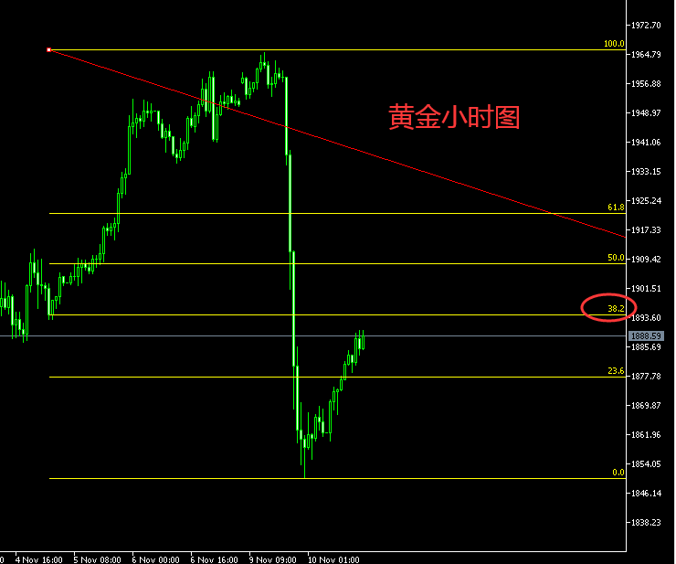 今日亚欧盘行情分析: 昨日出疫苗的消息,黄金单日跌幅达115美金,从早盘1965的高点跌至尾盘1850的低点,形成吞没断崖式的跌幅。消息面的影响大于技术面,现在大选还没官宣,疫情双重影响下,请大家一定做好风险控制,带好止损轻仓操作,规避不必要的损失! 如图所示,我们先来看看昨日这轮跌幅的黄金分割线。0.382分割线压制在1895附近,50%分割线压制在1908位置。一般来讲,极弱行情反抽不会突破0.382的压制,所以今日先看0.382分割线的压制去做空,若突破了我们再考虑备选策略。昨日首次下探的低点在1901位置,这里是顶底转换压制,所以今日反抽关注这两个压制做空即可! 简单理解