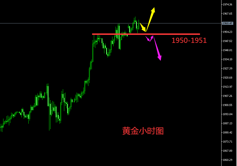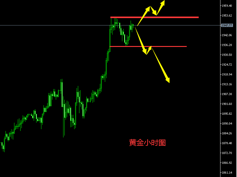 今日行情分析: 黄金昨日单边震荡上行,基本无回调,单日涨幅达50美金,这是近期比较少见的。既然日线大阳,而且破位宽幅震荡的区间,那么操作上只有逢低做多为主了,暂时就不要去参与空单了。 前期宽幅震荡区间的顶部在1931-1933位置,昨日突破后,这里形成了顶底转换的强支撑位,所以今日行情给到1931-1933位置做多即可。前期二次下跌口压制在1960附近,前期高点在1973位置。所以今日回落给到1931-1933位置做多,看1960-1973。 操作上,回落给到1931-1933位置做多,损1925,目标看1960-1973位置。若下行跌破,那么给到1916-1917位置继续做多,