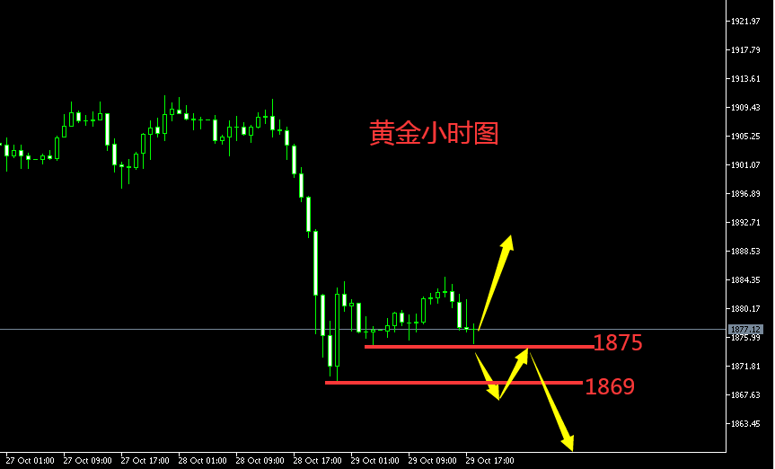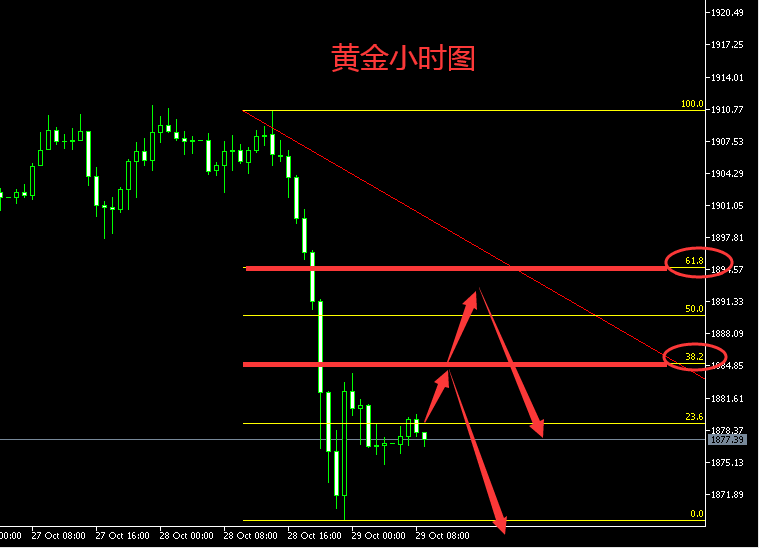 今日亚欧盘行情分析: 黄金昨日走了一个单边下行,从1910附近跌至1869位置,跌幅达40美金,这是近几天比较少见的行情。昨日我们亚欧盘预计1891做多的,但是美盘丝毫没有止跌迹象,所以我们在1890附近直接反手参与了空单,拿下了一部分利润,尾盘在1872附近反手参与了多单,也有一定利润!行情瞬息万变,需要及时根据盘中实际情况进行策略和思路的调整。 昨日大跌,今日重点是看震荡调整还是延续跌势。昨日尾盘反抽的高点在1884-1885位置,同时昨天这轮跌幅的0.382分割线压制也在1885位置,也就是说,今日上方短线压制在1884-1885位置,反抽不破此位置,那么今日可能会延续跌势,继