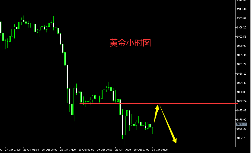 美盘后市行情分析: 黄金在美盘前跌破了 1875的早盘起涨点位置,我们逆势的轻仓多单也小损3个点离场,下破后,激进的直接轻仓追了空单,目前也小赚持有中。今天行情比较可惜,早上1884最高点的空单没有拿住,因为并未跌破前一个交易日的低点,没有续跌,所以最高点的空单也直接走了。 行情既然已经下破了,那么后面就高空为主了,也就不要再去做多了,下方只有一个 1850的支撑,若跌破1850,那么直接可以看到1820-1815附近。亚欧盘低点1875现在已经变成了顶底转换压制。 简单理解,反抽给到 1875附近做空,破1882离场,目标看1850。若跌破1850可继续持有到1820下方!