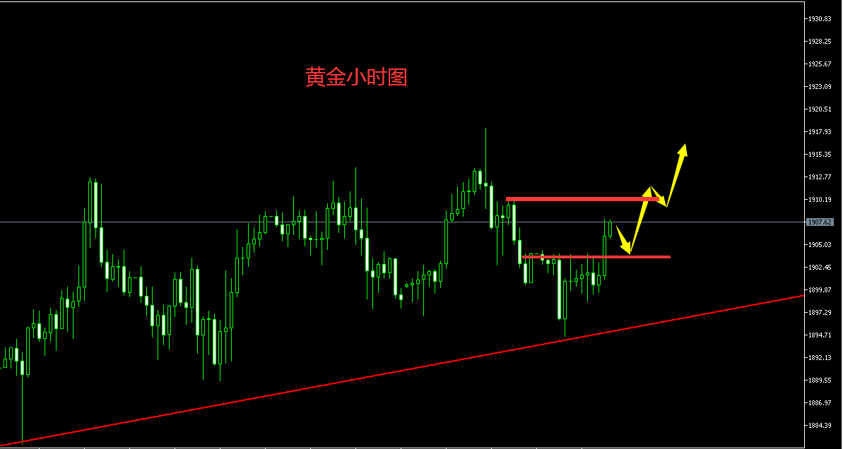 亚欧盘行情分析: 黄金目前依旧在宽幅震荡,昨日美盘一根大阳线吞没了一天的震荡,今日早盘延续昨日尾盘的强势,目前最高触及 1916.7附近。 黄金目前整体震荡偏多走势,但是依旧没能摆脱目前的宽幅震荡,所以操作上切勿追涨杀跌。昨日美盘下探的低点在 1897上方,这里是今日多头的防守位,昨日尾盘下探的低点在1905附近,日线5日10日均线粘合向上发散形成支撑,大概点位在1906附近。所以今日下方支撑就在1905-1906位置。周线10日均线的压制在1923附近,前期下跌口压制在1925位置,所以上方关注1923-1925的压制即可。 简单理解,今日行情给到 1905-06附近做多,破1