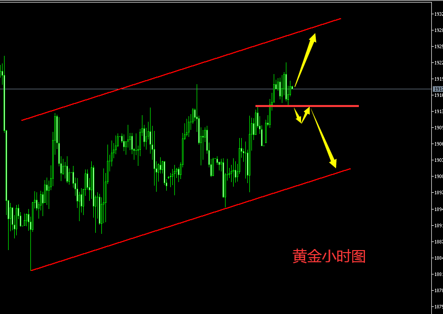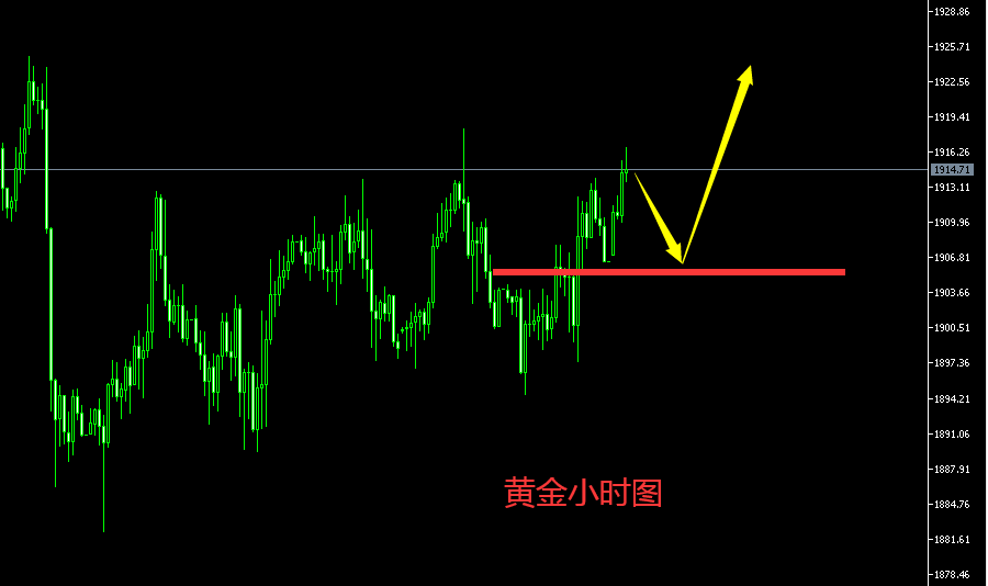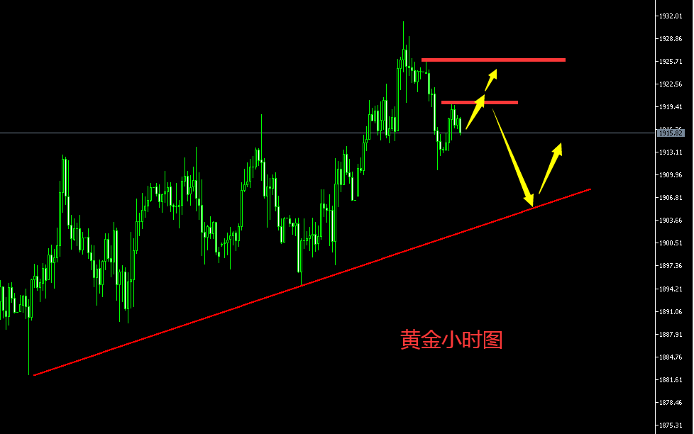 美盘行情分析: 黄金在欧盘最高触及1922.6附近,符合我们欧盘的思路,我们欧盘给出的思路就是在1923位置会受阻回落,但是目前仍然是偏多运行,但是并未走出突破,所以操作上我们需要慎之又慎! 现在的黄金,关键就是会涨到哪里,能涨到哪里,因为目前行情并未摆脱震荡,持续在调整,一味看多风险也是存在的,所以这行情是比较难搞的,参与的朋友一定要注意风险,放低仓位。 欧盘冲高后回落的低点在1914位置,美盘就以这个位置为分水岭,因为跌破此位置就破坏了上涨的形态。不破此位置,行情看好继续震荡反弹,预计能到下跌口1925以及次高点1932附近。若跌破了1914这个位置,行情可能会震荡回踩四小时