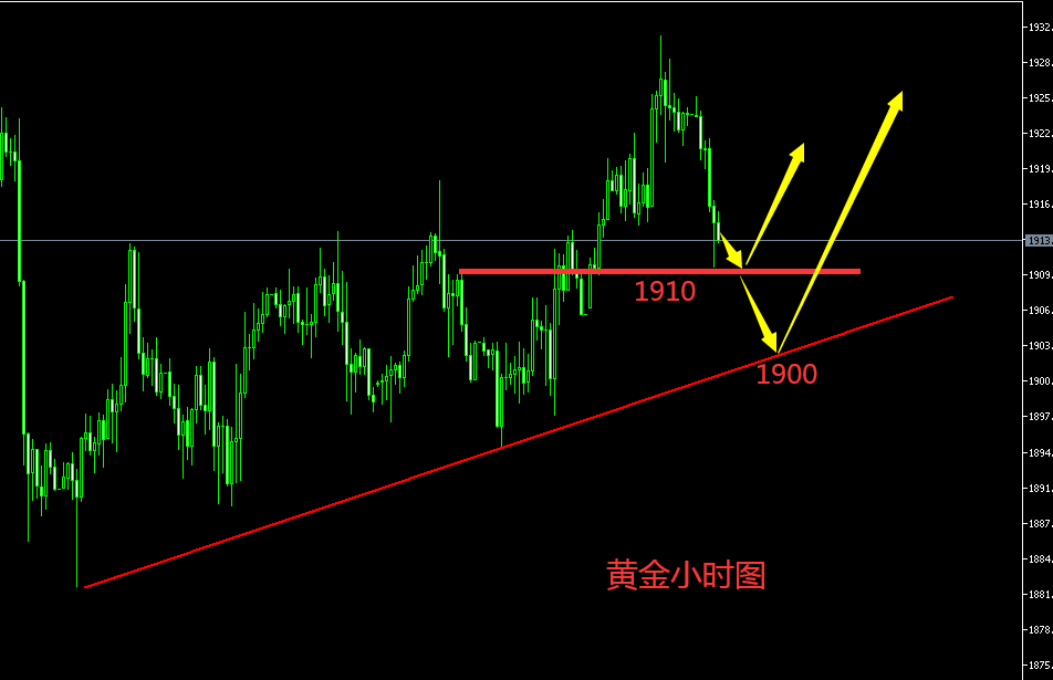 亚欧盘行情分析: 黄金昨日冲高至 1932附近后震荡回落,早盘延续昨日尾盘跌势,目前最低触及1910附近,现在稍有反弹,报1915附近。 上方关键压制在今日早盘下跌口 1925-1926位置,只要此位置不失守,今日震荡下行的概率比较大。下方短线支撑在早盘回落的低点1910位置,这里是昨日早盘起涨点位置,也是日线5日和10日均线支撑位置。强支撑在四小时上行趋势线1900附近,同时这里也是日线20日均线支撑,也是布林带中轨支撑,这里是多头最后的支撑位,具有非常强的支撑。 简单理解,今日行情若先反抽到 1925-26做空,破1930离场,目标看1910附近。回落不破1910反手做多,跌