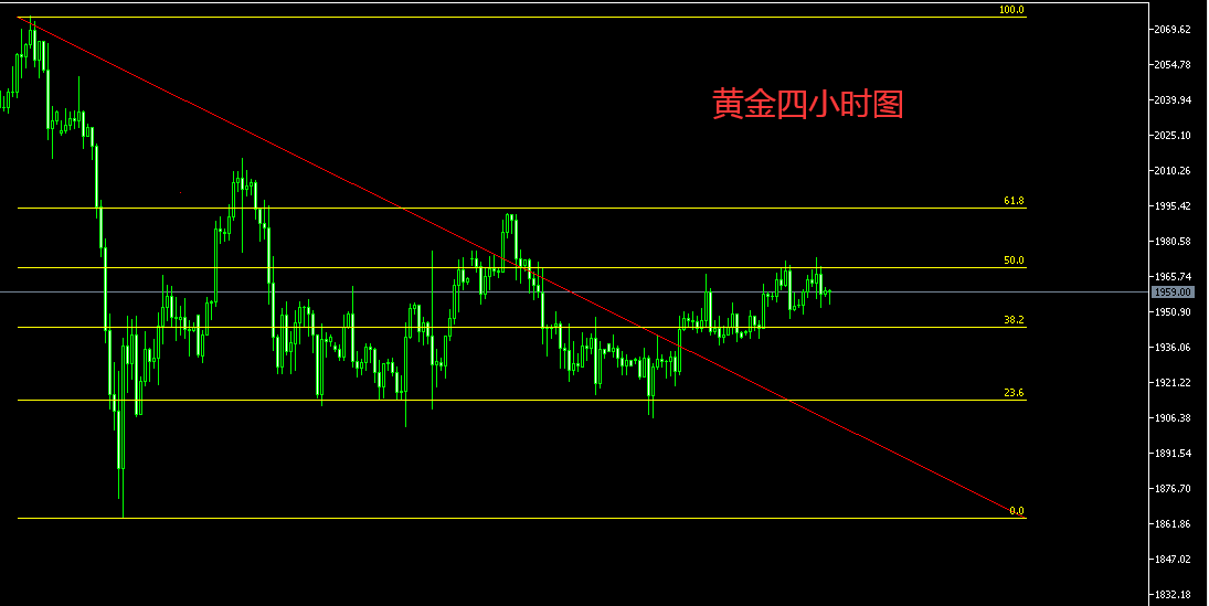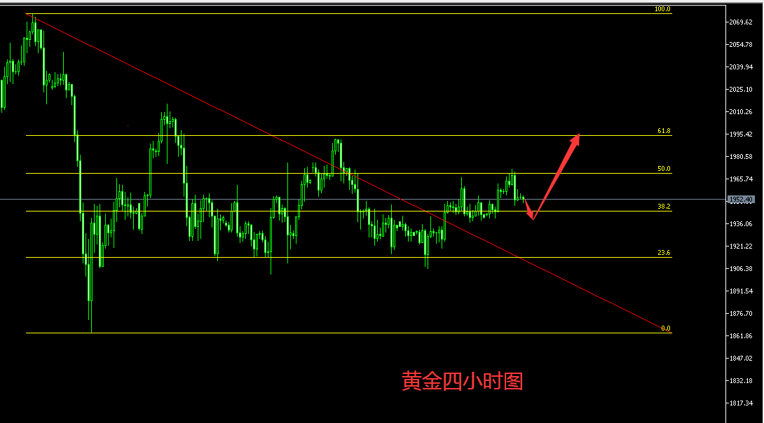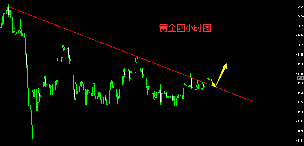 今日美盘行情分析: 黄金早盘最高反抽到 1960附近后短线调整,最低触及1937附近,欧盘低位横盘,持平早盘低位,最低触及1936.7附近,黄金整体依旧是震荡走势,切勿追单。 如图所示,这是黄金四小时图,现在的走势是突破日线三角整理之后的一个回踩动作。一般在行情突破趋势线或者某个结构后会有一个回踩确认,若回踩确认支撑有效,那么可以确认结构或者趋势线成立。目前的行情就是这样,正在回踩测试三角上破后的支撑,若今明两天回踩确认有效,不再跌入三角整理之内,那么基本可以确认上升三角结构成立,后市黄金可期,届时可以布局波段中线多单,耐心等本周确认完毕。 我们来看看日内行情,日内是偏空的,这点