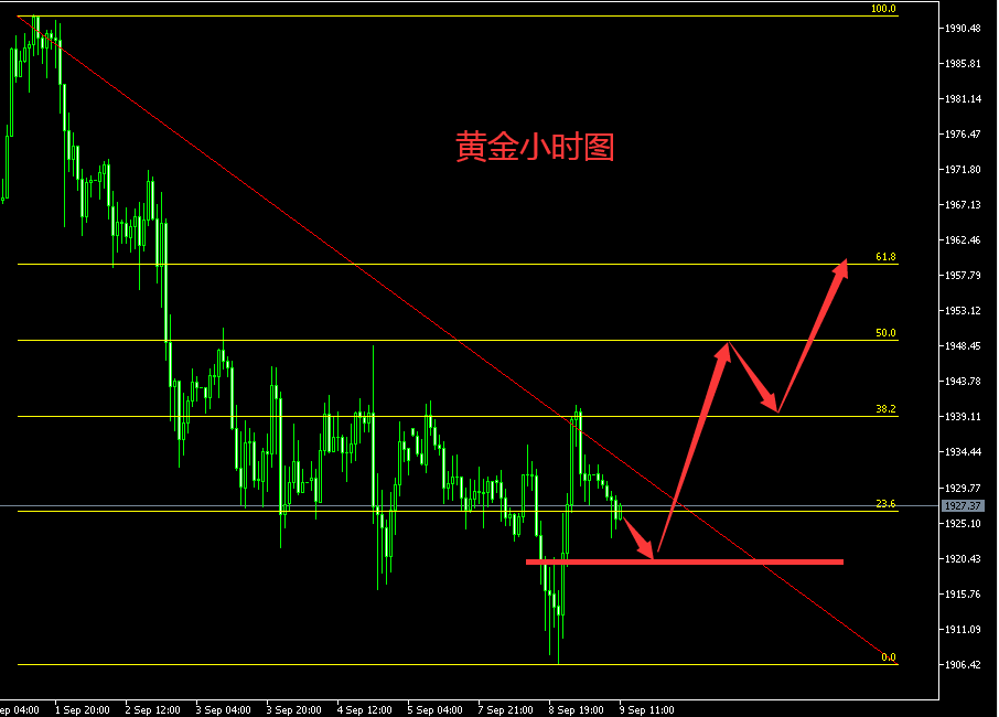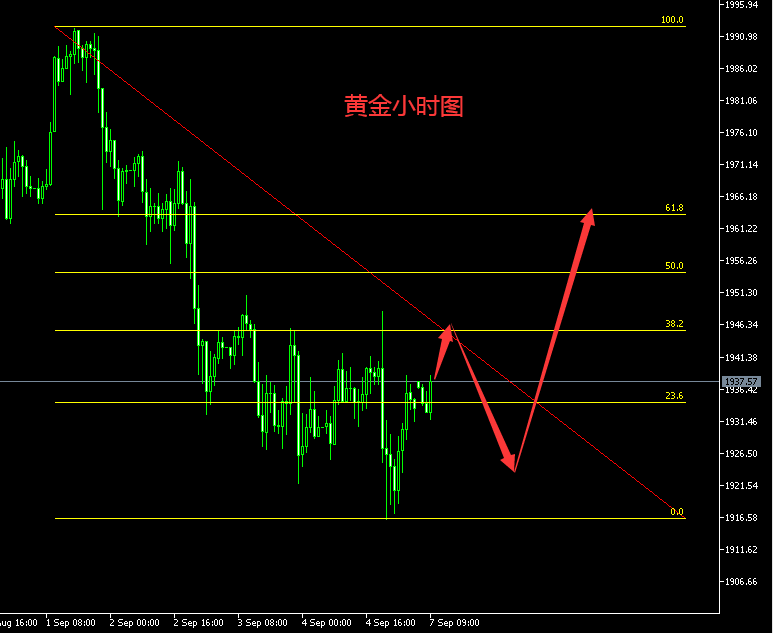 今日行情分析: 昨日由于美国劳动节的影响,欧美盘行情波幅并不大,整体小幅震荡整理。低位横盘了很久,现在的行情面临多空抉择,所以希望各位投资者多看少动,争取等确定了方向再进行操作。 上方短线压力在 1941昨日高点位置,强压在1945-46的0.382分割线压制位置。下方短线支撑在1923周五尾盘起涨点位置,强支撑在非农低点1916-17位置。若下行跌破1916非农低点,下方可见1908-1903前期低点位置。若上行突破1946-1948非农高点位置,上方可见1955-1964! 简单理解,今日行情上行关注 1941以及1946的压制做空!回落到1922-23附近轻仓做多,损191