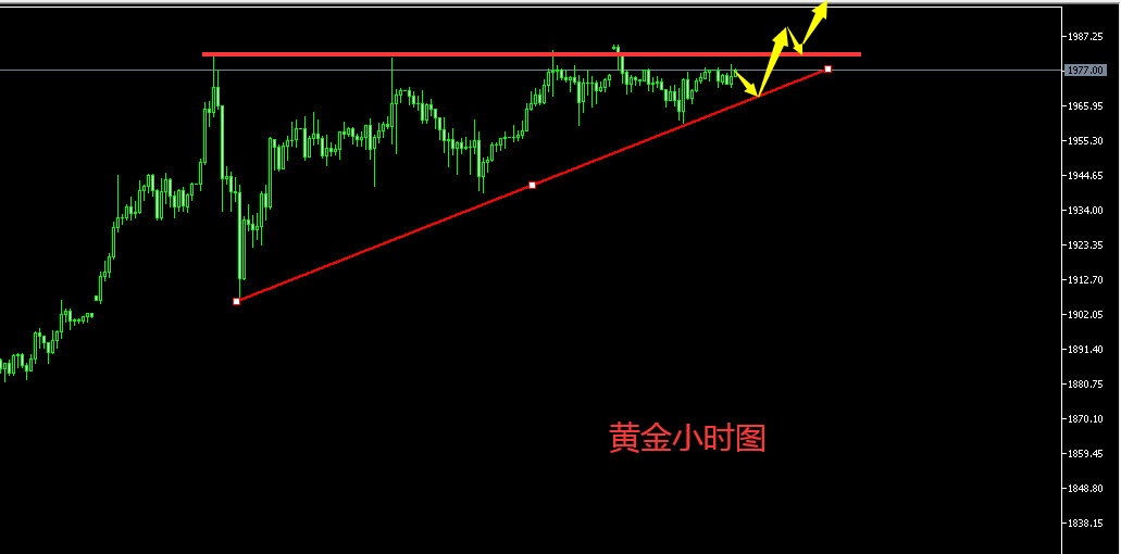 欧美盘行情分析: 黄金在早盘冲高后回落,没有延续开盘后的强势行情,现在一直处于日内低位震荡,现报 1973 附近。 黄金整体的思路目前还是没有变的,依旧是逢低做多为主,早盘强势拉升未能站稳 1980 上方,那么行情会进一步回落测试小时线上行趋势线的支撑,时间换空间,支撑会不断上移,目前的支撑区域在 1963-64 附近,这里也是我们欧美盘参与多单的位置。防守就放在周五美盘低点 1959 位置! 若欧美盘上行直接突破早盘高点 1985 位置,那么回踩 1978-1981 位置参与多单即可。若回踩确认有效,那么上升直角三角形结构将正式成立,未来 1-2 周站上 2060 不是梦想。当
