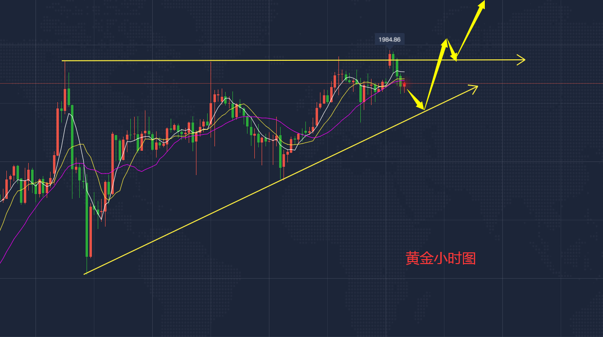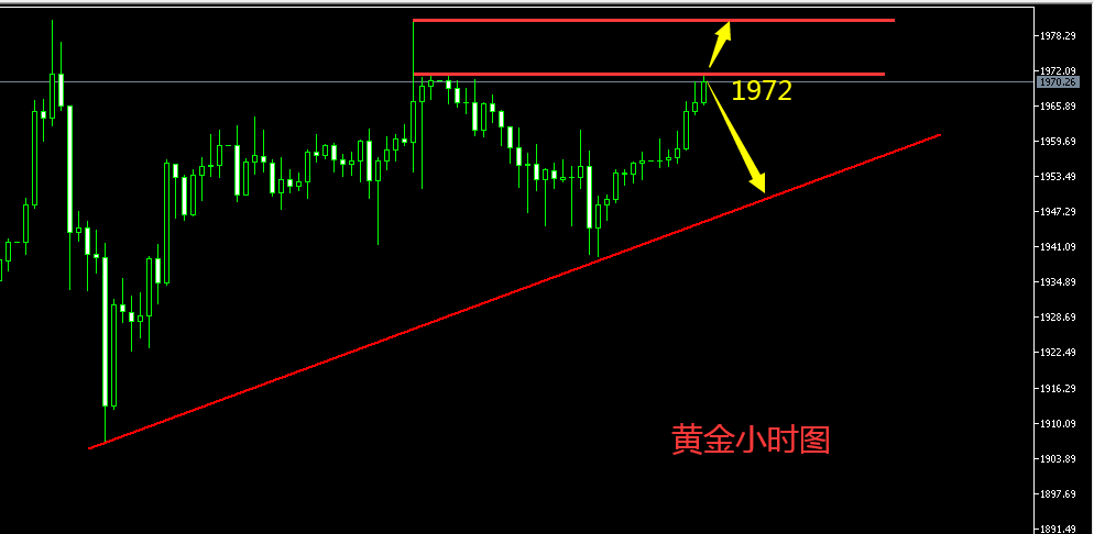 黄金下周行情分析: 黄金上周突破 1900 点,最高到达 1982 出现买盘获利了结,随后开始宽幅震荡洗盘,多空争夺,市场出现分歧,但是并未改变强势多头。 如图所示,这是黄金四小时图,目前走势是一个上升直角三角形结构,根据结构判断,若能上破直角边,那么 2000 点手到擒来。而且突破后的涨幅是可以测算的,理论涨幅是可以达到 80 美金,也就是说突破后的理论高度,是可以看到 2060 附近的!这给做波段的朋友提供一个强有力的依据,当然成立的条件,要能突破站稳 1980 上方。 小时线的上行趋势线支撑大概在 1960 附近,正好这个位置也是周五美盘下探的低点位置,时间换空间,支撑会逐
