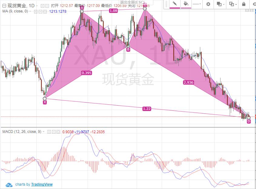 黄金行情昨天晚上终于还是破1200的强支撑,刚周末提醒震荡不了多久,周一就直接一波从最高1213掉到了1191,大幅的单边行情,连带着给出的区间震荡建议也被扫损,跌了那么多,空单的建议我也没敢给,我个人的看法不太认为下方有太大空间,说一下对行情的看法: 1,跌了这么多,也破了1200,是不是无脑空了哪?我觉得还是先看一看,至少今天先看看,先不急着进,这波下来已经23个点了,直接强行追,我不认为有那么大的行情。 2,其实从日线1309-1237的AB=CD形态来看,D点的位置刚好在1194,也是就是昨天行情的收线的位置附近,其实从波浪尺看,1309-1237的向下延伸,在0.618位置也就12