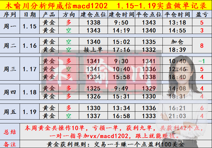 木喻川:1.20周评黄金本周行情回顾及下周行情预测 大家晚上好,我是木喻川!周五行情结束,一周的时间又过去了;时间总是不会停止前进的步伐,如果你还停留在过去,那么你永远没办法进步;这也说明在我们的投资道路上,任何时候都将是一个新的开始,只要你在这个市场,只要你还在交易,所有的结果都会是一个变数,今天的你决