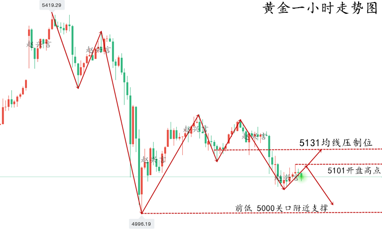 黄金晚盘重现了周二晚间的跌幅,虽说白盘周三和周四的走势都极其相似,但最终行情还是走了二次下跌,晚盘截止当前,跌幅又是百点起步,也和兴言之前一直提到的观点一致,就是当前来看,行情要不走时间换空间的走势,要不就需要二次回撤蓄势方能有新的动能,短线来看,空头之路依旧还有没彻底完结,短线操作上还是以高空为主。 小时线上尾盘首要关注下方4996-5000的整数关口支撑,上方顶底转换压力在5120一线,目前先行看后续走势情况,做短线多空的布局操作了!具体的实时操作,可以以兴言实盘提示为主! 所谓一个靠谱的人,凡事有交代,件件有着落,事事有回音,兴言一直致力于市场,唯有坚持写出对投资者有用的分析,少错一单