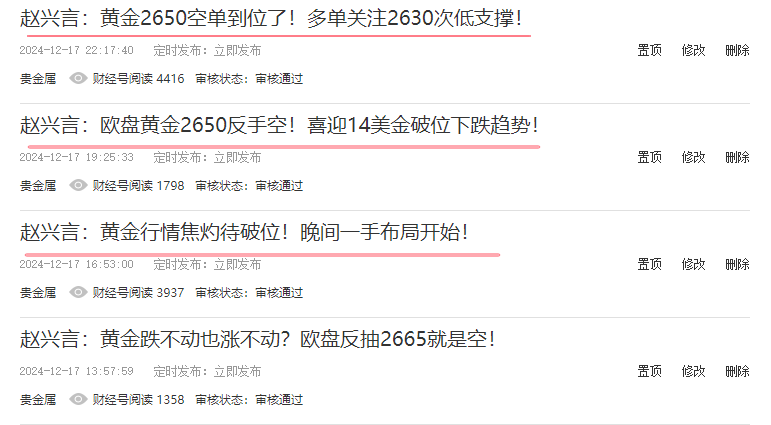 渔夫出海前,并不知道鱼在哪里?可是他们还是选择出发,因为他们相信自己会满载而归。你投资的时候,也并不知道是否能盈利,但你还是需要去尝试, 并且决定去做的那一刻起,坚持相信了才有收获。黄金投资也一样,当前的你或许仍然还在亏损,但只要找到兴言,一切亏损都会迎刃而解! 昨日黄金操作回顾! 昨天的行情比较平淡,除了早间有一波下跌之后,基本上欧盘美盘前半段都是横盘, 兴言也是早早提示学员们在2664进场空单,晚间凌晨最低也是下跌到了2648一线!昨天也是喊了一天的2663-65做空,只要跟了,基本上都有肉吃! 黄金走势分析解读! 今日方面,黄金在昨日出现二次反抽下跌,而在昨日晚间美盘的交易当中也提示到
