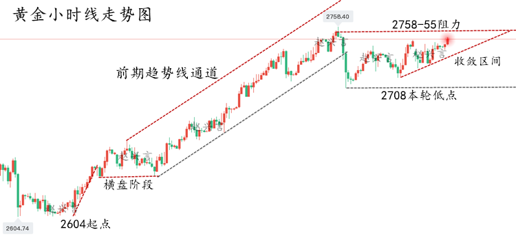 分析不能当饭吃,却是吃饭不能丢掉的家伙,或许你觉得看到兴言策略时已经为时已晚,那么告诉兴言你,当你后悔莫及时正是从头开始时! 这个市场没有谁可以完全预测行情,却有人会用踏实的分析努力避开风险。如果你看了兴言每天连载的文章,我相信你会对行情有新的认识与见解! 黄金为何连阳上涨? 1、 因美国大选和中东冲突的不确定性以及对美联储降息的预期,在俄乌战争的可能性不断上升的背景下 ,现货黄金大涨逾32美元,并刷新历史高位。 2、只要美国大选风险继续影响市场情绪,而美联储降息预期保持不变, 金价应该会保持上行倾向,甚至可能在未来几天触及2800美元/盎司! 黄金走势分析解读! 从当前的走势图上看,黄金昨