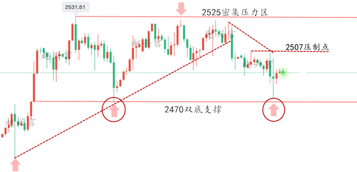 现货黄金在一度跌至2485美元/盎司后大幅反弹,最终收盘突破2506美元/盎司。“ 黄金可能会相当巩固,或许会在黄金既定区间内稍微波动。”加上当前“市场似乎更认同美联储会小幅降息25个基点,这也是我一直以来的立场 。”由于黄金不生息,利率下降可减少持有黄金的机会成本,增加其投资吸引力。 本周风险事件重点关注 1、投资者现在聚焦周三将公布的美国8月消费者物价数据(CPI),以及周四将公布的生产者物价指数(PPI)。 2、中东局势依然紧张,加上当前伊朗再向以色列“放狠话”,这将给金价提供反弹动力。 日内黄金走势分析解读 黄金方面,昨日按照预期下跌,但且没有破前期支撑位2080低点。加上行情没有延