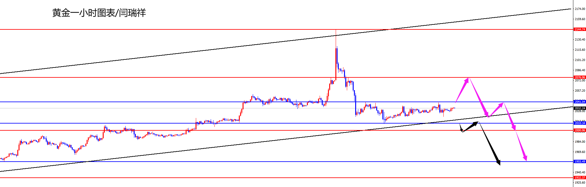 【美元指数】 美元指数方面,上周五美元指数价格总体呈现下跌的状态。当日价格最高上涨至103.818位置,最低于103.328位置,收盘于103.395位置。回顾上周五美指价格表现,早间开盘后价格短线先震荡运行,随后价格呈现偏弱表现,美盘价格进行加速下跌,但是从整体看美指暂时维持在103.10-104.50区间震荡运行,价格不破上周低点同时有继续上行表现,如若下破则需要关注102.20区域再度进行多。所以暂时先关注103.10位置得失。 美指暂时关注103.10得失 【黄金】 黄金方面,上周五黄金价格总体呈现上涨的状态,当日价格最高上涨至2003.48位置,最低下跌至1991.31位置,收盘于