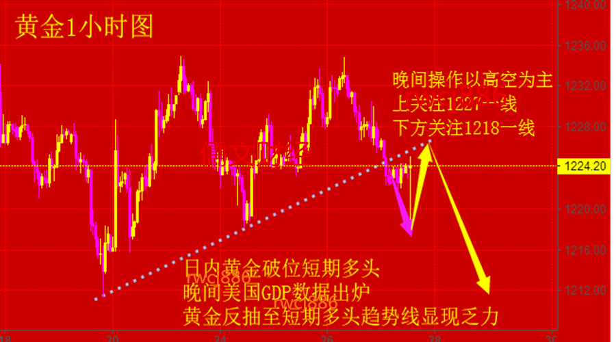 日内黄金破位短期多头 晚间美国GDP出炉,黄金反抽至短期多头趋势线,显现乏力 晚间操作上还是以高空为主 晚间操作策略:晚间反抽1225一线空,止损1228,目标1221-1218