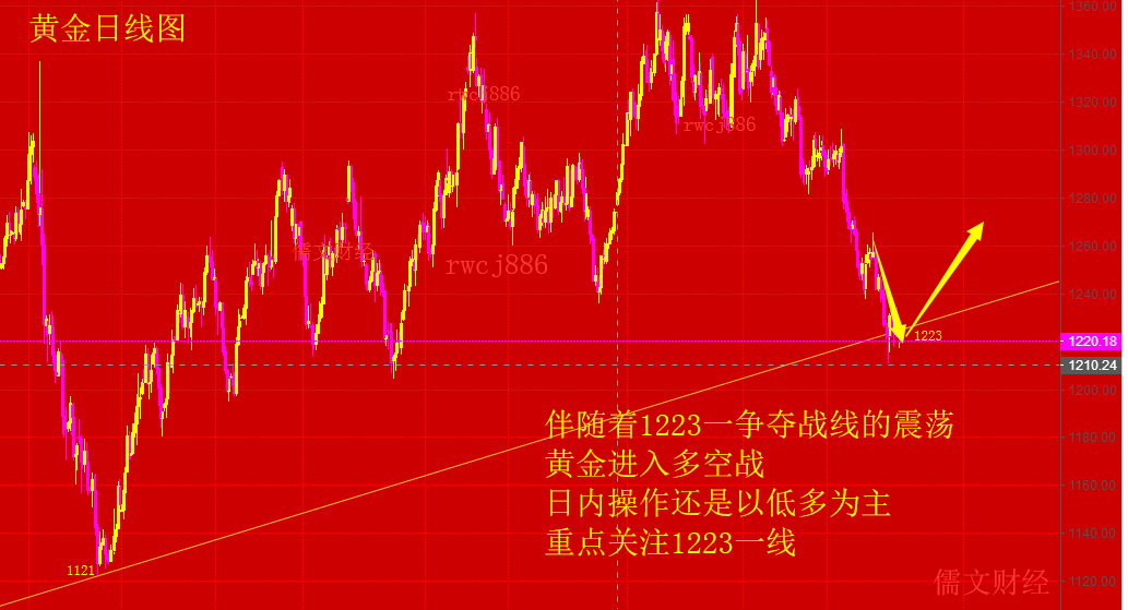 时间飞逝,在这匆匆而逝的时间里,我们百感交集,收获与失去同在,但是我们在失去同时,得到的对得起我们失去的吗?每个人的情况不一样,衡量得失的标准也不一样。而在儒文看来,虽然失去了更多的自由时间,但是却得到了更多的认同,让跟着我操作的投资者避免亏损,获得更大的利润,这也是我隐藏的财富! 黄金目前的走势也是符合儒文周末时提到的操作布局,周初黄金的短线回调至1218一线震荡。而美指也继续下抽,黄金势必会出现拉升,目前的同向在儒文看来,只是诱空的噱头。日本央行维持利率不变,但充许10年期收益率上下浮动,将在债券操作中增加灵活性。加拿大未获准参与本周的北美自由贸易协定高层对华。贸易问题和日本利率决议承压