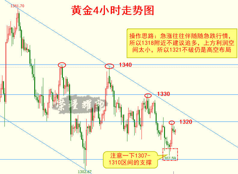 投资市场,每个人都在不断的换老师,可市场的水不比现实的浅,倘若自己没有学习的心态,跟了再厉害的老师,也是无用功,因为无法彻底斩断亏损的恶魔。解决的根本,还是要借助老师是技术,不断充实自己,自己学会了游泳,到哪都不会溺水! 3.19行情复盘 昨日开盘直到美盘前,行情波动并不大,一直在1310附近徘徊,早间行情波