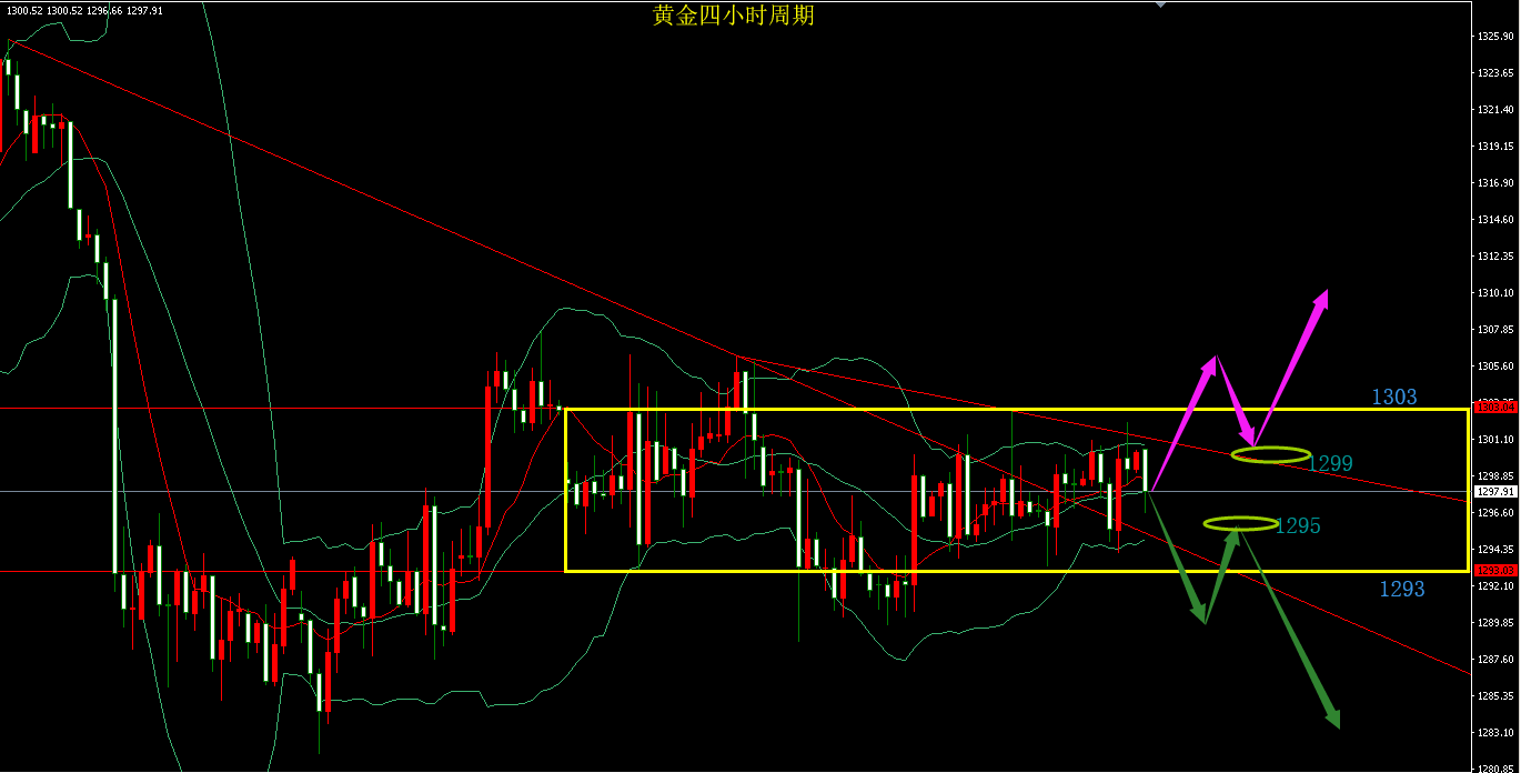 "不忘初心,方得始终",相信这句话很多人都听到过,但是真正做到的人又有多少呢?你是否还记得你当初为了什么才做这份投资的,那又不知你的现状是否是当初想象的那个样子;如果不是,那你是否违背了自己当初的想法和初衷; 不管做任何事情都要有自己的想法和明确的目的,认准目标之后,就要坚持不懈地朝着你目标去奋斗;但如果在前进的道路上你发现自己所选择的目标是不对的,那你应该去及时地找出问题所在,把它解决掉,让自己重新站在梦想的道路上继续朝着你的目标去奋斗:不忘初心,方得始终。 昨日黄金因周初市场清淡,整体而言行情波动不大,区间1298~1290震荡整理,早间开盘小幅反弹上扬短线承压小时周期MA10下挫止步1