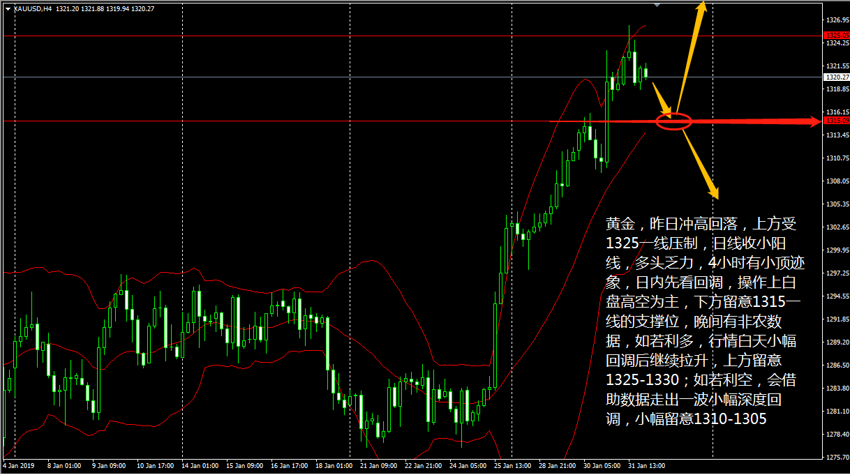 黄金昨日冲高回落,上方受1325一线压制,日线收小阳线,多头已有乏力现象,而在4小时图上看,行情有小顶迹象,MA5均线下穿10均线,与MACD、KD线的死叉行情一致,预计短期内行情将进一步下探。 王德勤建议,黄金日内先看回调,白盘操作上以高空为主,下方留意1315一线的支撑位。晚间有非农数据,如果利多,这继续看涨黄金,上方留意1325-1330;如果利空,行情则将借助数据走出一波小幅深度回调,下方留意1310-1305美元一线。 原油昨日同黄金一样冲高回落,1小时图中看,目前行情下方已经小顶,布林带三轨走势朝下,MACD的死叉与KD线的上升产生背驰,4小时线上看,行情在走出一波过山车行情后企