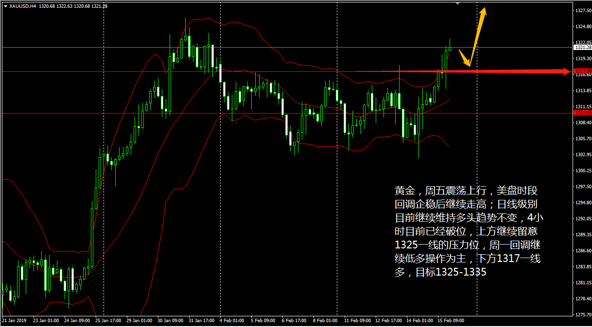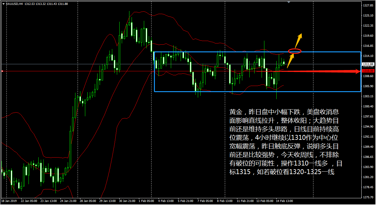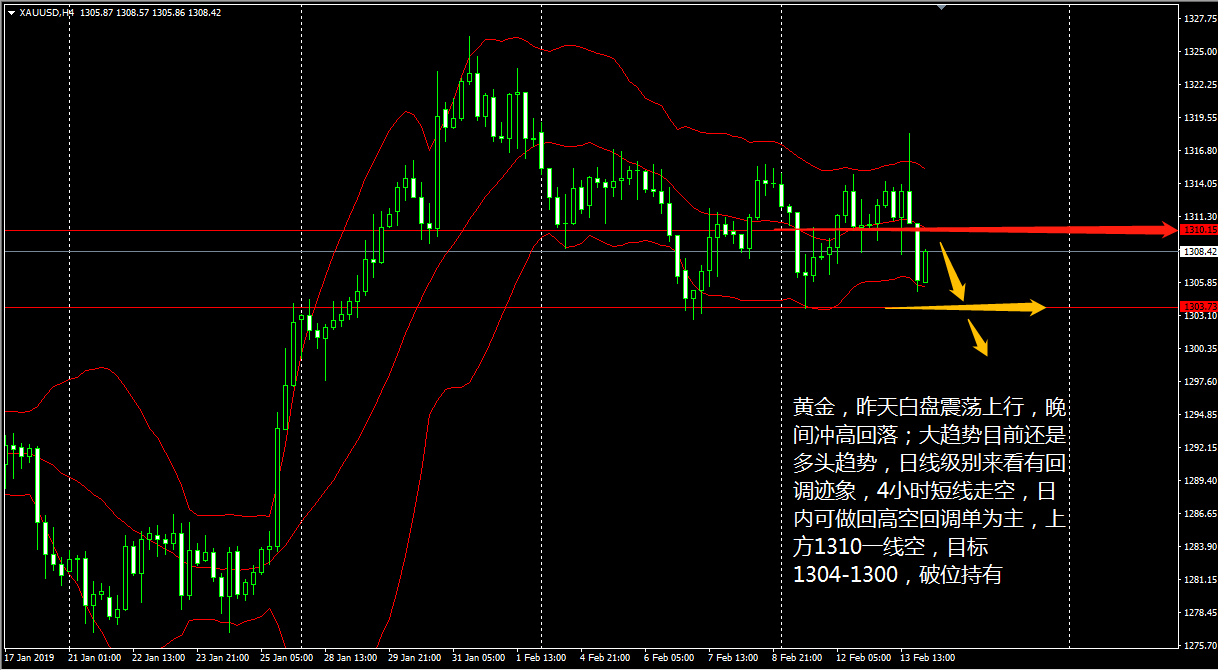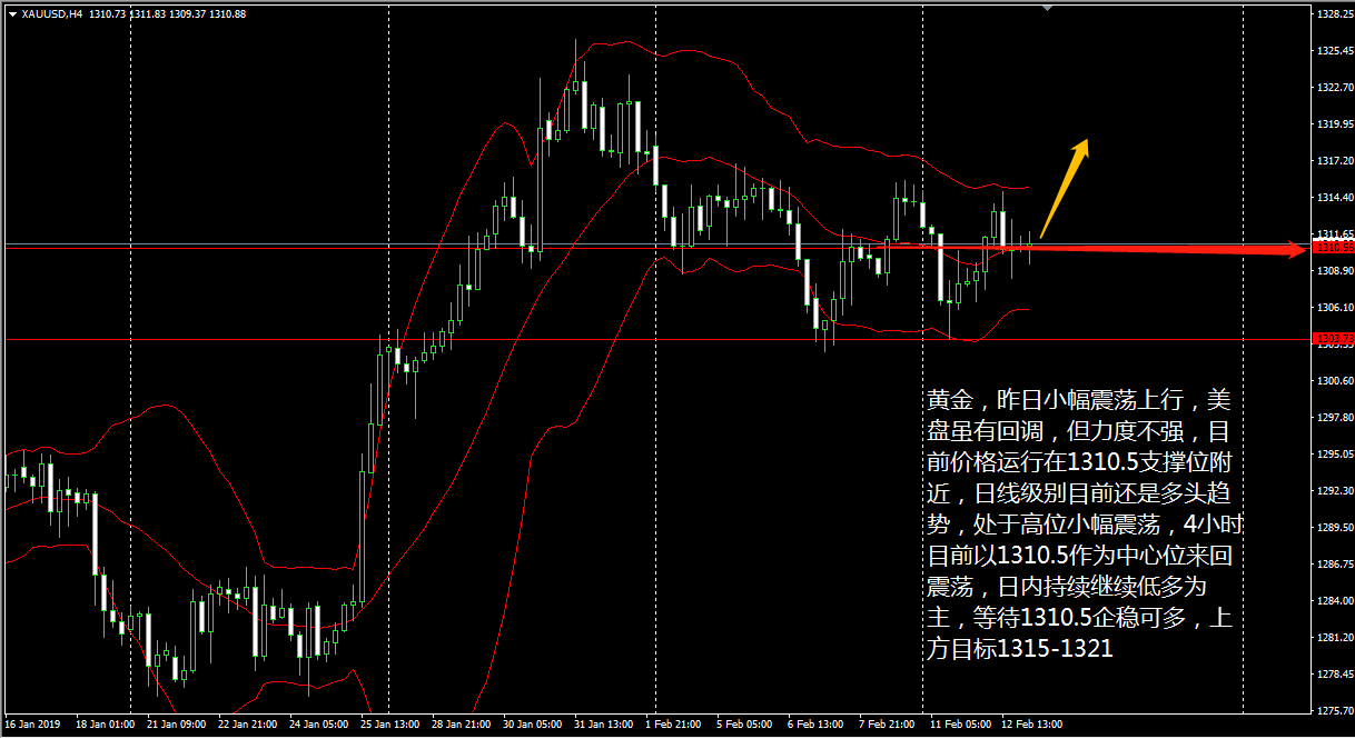 黄金昨天白盘震荡上行,晚间冲高回落 ; 大趋势目前还是多头趋势,今日 (2 月 14 日 ) 黄金低开于 1305.91 美元 / 盎司,目前亚市早盘,金价交投在 1308 美元附近,涨幅 0.14% 左右。 从日线级别来看,黄金行情经过整理之后,价格开始逐步走回调, 4 小时级别上,昨晚行情下触布林带下轨的支撑位反弹,表明黄金整体还是在走区间震荡。目前 KD 线保持下行, MACD 窄幅运行于零轴下方,看来黄金短线还会再度下行。 操作上王德勤建议,日内黄金可以高空回调单为主,上方 1310 一线空,目标 1304-1300 ,破位持有。 镑美昨天在欧市午盘后大举飙升,短线飙涨 65 点至