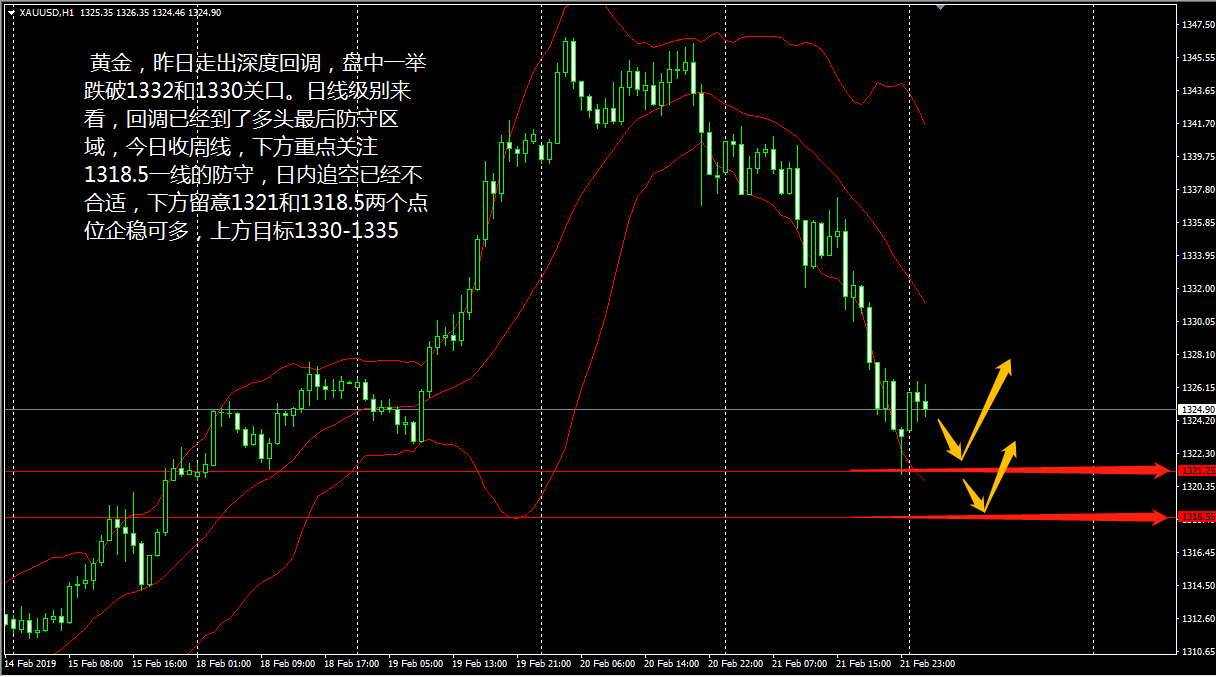 周四(2月21日)黄金走深度回调,盘中一举跌破1332和1330两大关口,日内最低下探至1321.58美元/盎司,1.5%的跌幅也是创下自去年8月15日以来的最大单日跌幅。 今天(2月22日)从日线级别来看,行情已经回调到了多头的最后防守区域,MACD的死叉行情有望形成。小时图上布林带走势朝下,下方200小时均线的1321.7附近形成支撑,MACD在下方超卖区附近形成金叉,KD线亦是如此,表明短期内金价有望小幅上移。 今日收周线,老王建议黄金下方重点关注1318.5一线的防守,现在追空已经不合适了,下方留意1321和1318.5两个点位,企稳可多,上方目标1330-1335。 镑美方面,昨天